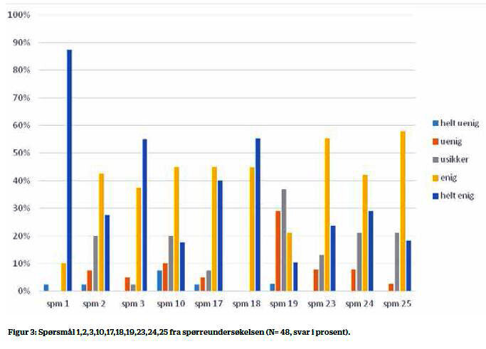Sammenfattet viste ­resultatene at hele 92 prosent av sykepleierne var enig/helt enig i at «Mobil intensivsykepleier gjør det mulig for meg å få hjelp når jeg er bekymret for pasienter». Åttiåtte prosent var uenig eller helt uenig i at «Jeg nøler med å kontakte mobil intensivsykepleier fordi jeg blir ­kritisert for ikke å ha fulgt opp ­pasienten min godt nok». Det var 83 prosent som var enig eller helt enig i at «Den basale overvåkningen og vurderingen av MEWS-skåre fører til at jeg i dag har bedre kontroll på pasienters tilstand». I påstanden «Undervisningen du deltok på har gjort deg bedre i stand til å vurdere pasientenes kliniske tilstand» var 81 prosent enig eller helt enige, og 66 prosent var uenig eller helt ­uenig i at «Jeg er tilbakeholden med å kontakte MIS fordi jeg vil bli ­kritisert dersom pasienten ikke er dårlig nok».