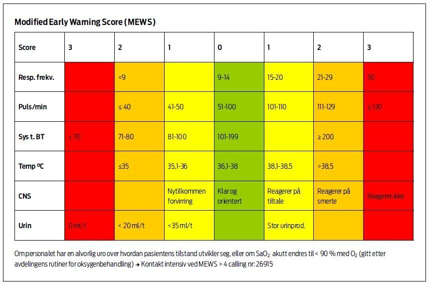 Hvilke skåringssystem finnes for å identifisere svikt hos dårlige pasienter? Det er utviklet mer enn 30 forskjellige varianter av Early Warning Score (11). Vi valgte MEWS i vårt prosjekt, som er et validert skåringssystem (9,10) som består av seks vitalparametere: Respirasjonsfrekvens, puls, systolisk blodtrykk, temperatur, CNS-status og urinproduksjon.