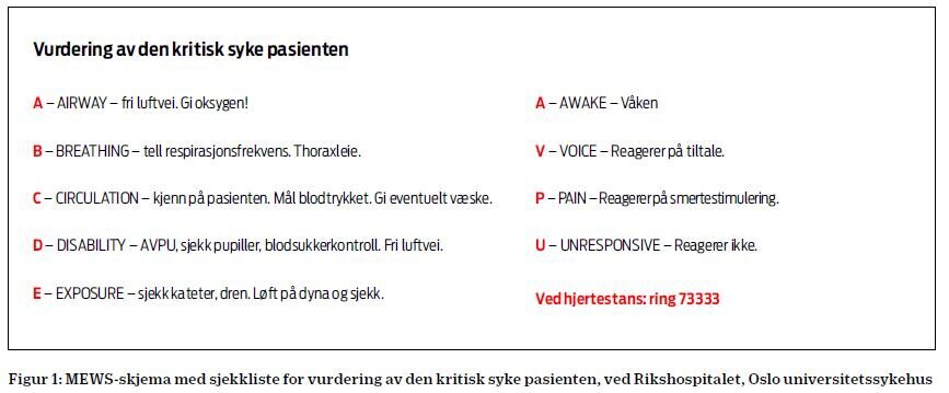 Høsten 2011 inngikk Oslo­ universitetssykehus Rikshospitalet og Lovisenberg diakonale­ høgskole et samarbeid for å ta i bruk Modified Early Warning Score (MEWS) og mobil intensivsykepleier. Vi valgte MEWS for å identifisere pasienter med risiko for å utvikle svikt i vitale funksjoner, og for å kontakte mobil intensivsykepleier. Mobil intensivsykepleier er en ordning med en erfaren intensivsykepleier som kan tilkalles og som møter opp på sengepost for en felles vurdering av pasienten. Dette gir sykepleierne mulighet for å få hjelp og veiledning 24 timer i døgnet.