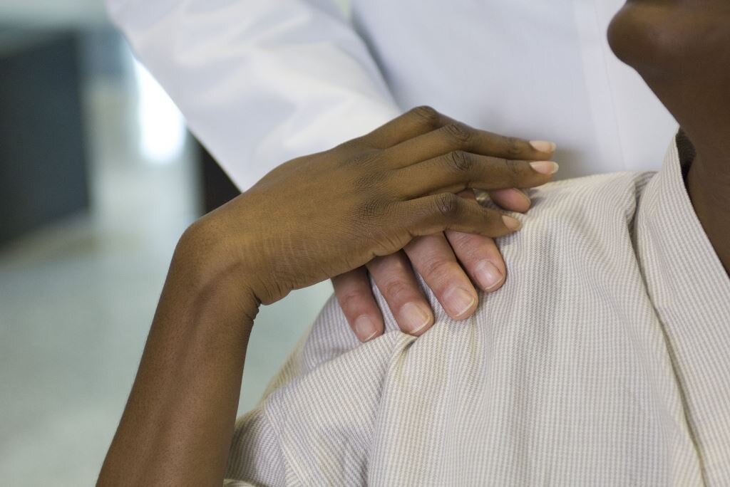 Hånden til en farget kvinne holder hånden til hvit mann.