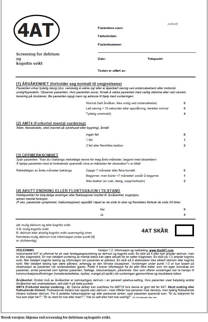 4AT er nå oversatt til norsk og vil i første omgang bli testet og validert og deretter tatt i bruk i klinisk praksis og forskning. En tverrfaglig gruppe med to sykepleiere, to leger og en fysioterapeut oversatte instrumentet uavhengig av hverandre. De fem forslagene ble deretter sendt ut til en utvidet gruppe, som i tillegg besto av fire leger, for vurdering og revidering. Den omforente versjonen av instrumentet ble så sendt til en tospråklig person som oversatte vår norske 4AT tilbake til engelsk. Deretter ble den engelske oversettelsen sendt inn til professor MacLullich som leder gruppen som er ansvarlig for den originale engelske versjonen. MacLullich hadde noen små kommentarer på vår oversettelse som vi i siste runde har justert i vår norske oversettelse av 4AT.