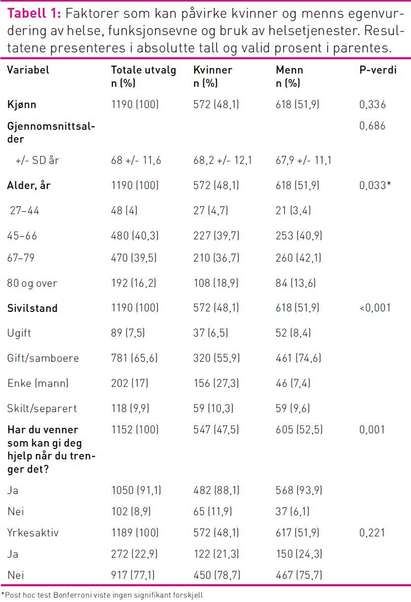 Tabell 1 viser utvalget på 1190 respondenter, med 572 (48,1 prosent) kvinner og 618 (51,9 prosent) menn. Gjennomsnittsalderen var 68 år, og post hoc tester viste at det det ikke var signifikante forskjeller i alder mellom kvinner og menn. Den eldste kvinnen var 95 år og den eldste mannen 88 år. Flere menn var gift eller levde i samboerforhold (80,9 prosent, p<0,001) mens flere kvinner var enker (p<0,001) eller bodde alene (p<0,001).