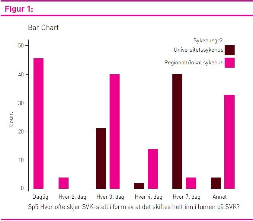 Når det gjaldt bytte av bandasje på innstikksstedet oppga de fleste respondentene ved universitetssykehusene hver sjuende dag eller hyppigere ved indikasjon. Respondentene ved de andre sykehusene skiftet bandasje langt hyppigere. Her var praksis ved universitetssykehusene i stor grad i tråd med CDC’s retningslinje.