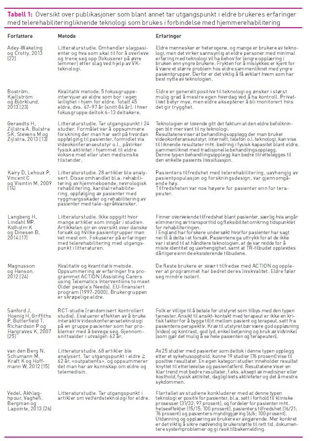 Tabell 1 gir en oversikt over oppsummert kunnskap der man har tatt utgangspunkt i eldre brukeres erfaringer med videokommunikasjonsutstyr eller tilsvarende teknologi som brukes i forbindelse med telerehabilitering.