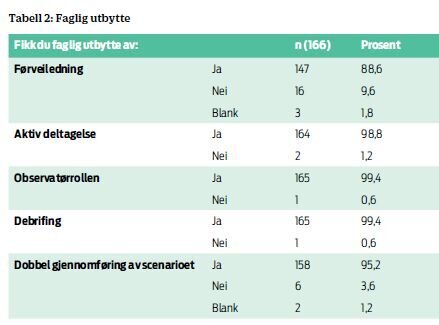 Omtrent alle studentene hadde faglig utbytte av fullskalasimuleringen (se tabell 2). Mangler i egen kunnskap var gradert fra 1 – ikke i det hele tatt – til 4 – i stor grad, og fikk middelverdi på 2,64. Gradert samlet faglig utbytte, der 1 var dårligst og 6 var best, fikk middelverdi på 5,30.