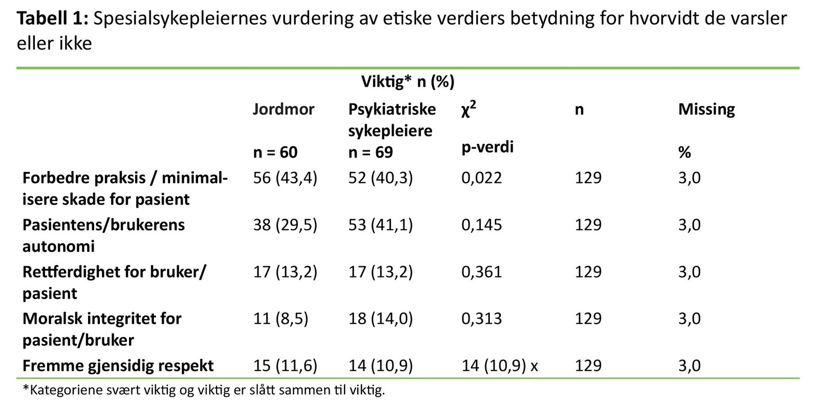 På spørsmålet om hvorfor det er viktig å varsle, ble det ikke skilt mellom egne avvik eller avvik andre hadde forårsaket. «Forbedring av praksis / minimalisering av skade» fikk høyest skår på rangeringen av hva som ble lagt til grunn for å varsle, men det var flere psykiatriske sykepleiere, 7,8 prosent (10), enn jordmødre, 1,6 prosent (2), som prioriterte dette som mindre viktig (tabell 1).