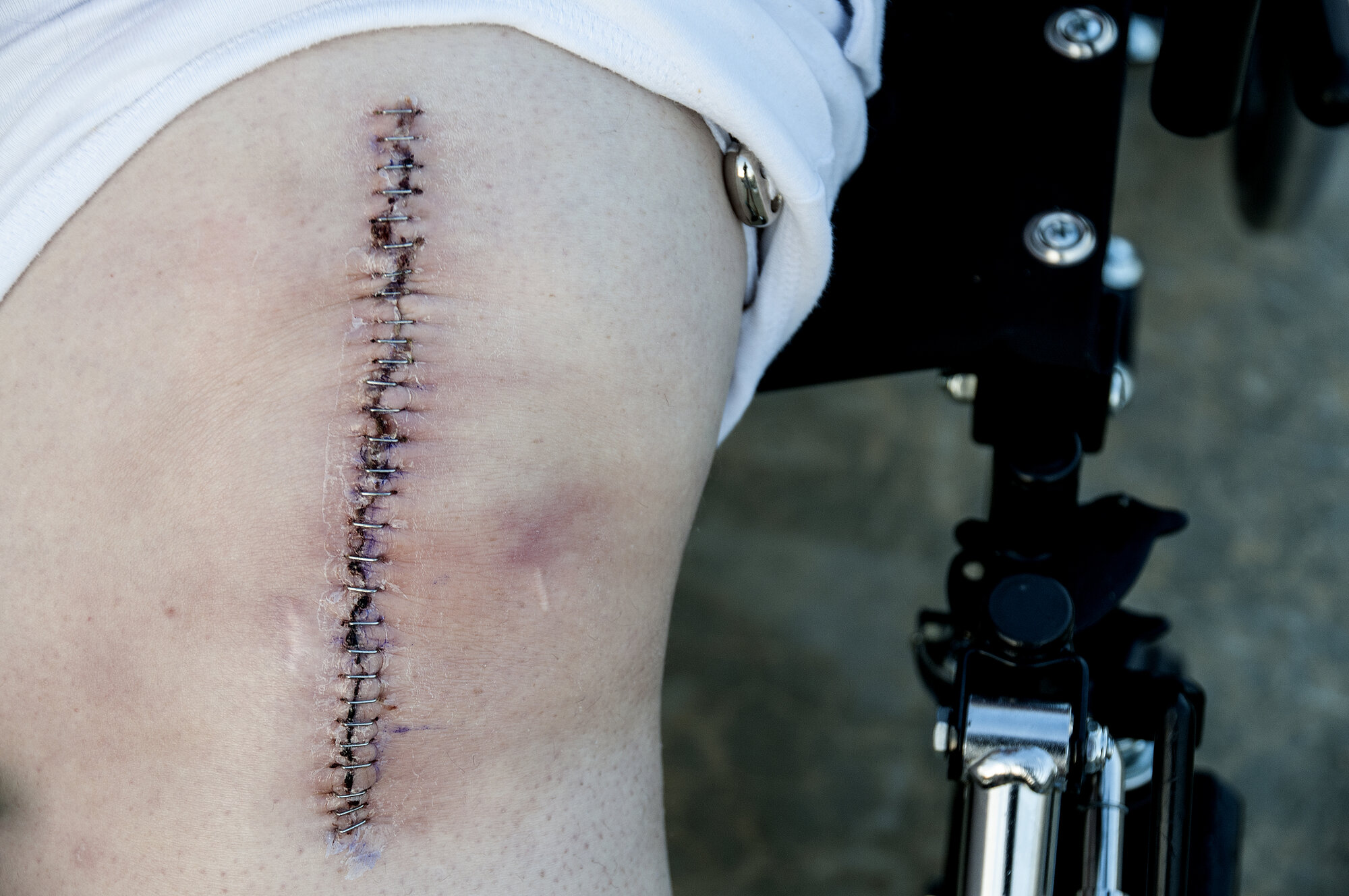 Bildet viser et kne med et stort, loddrett arr etter en total kneoperasjon (total kneprotese).
