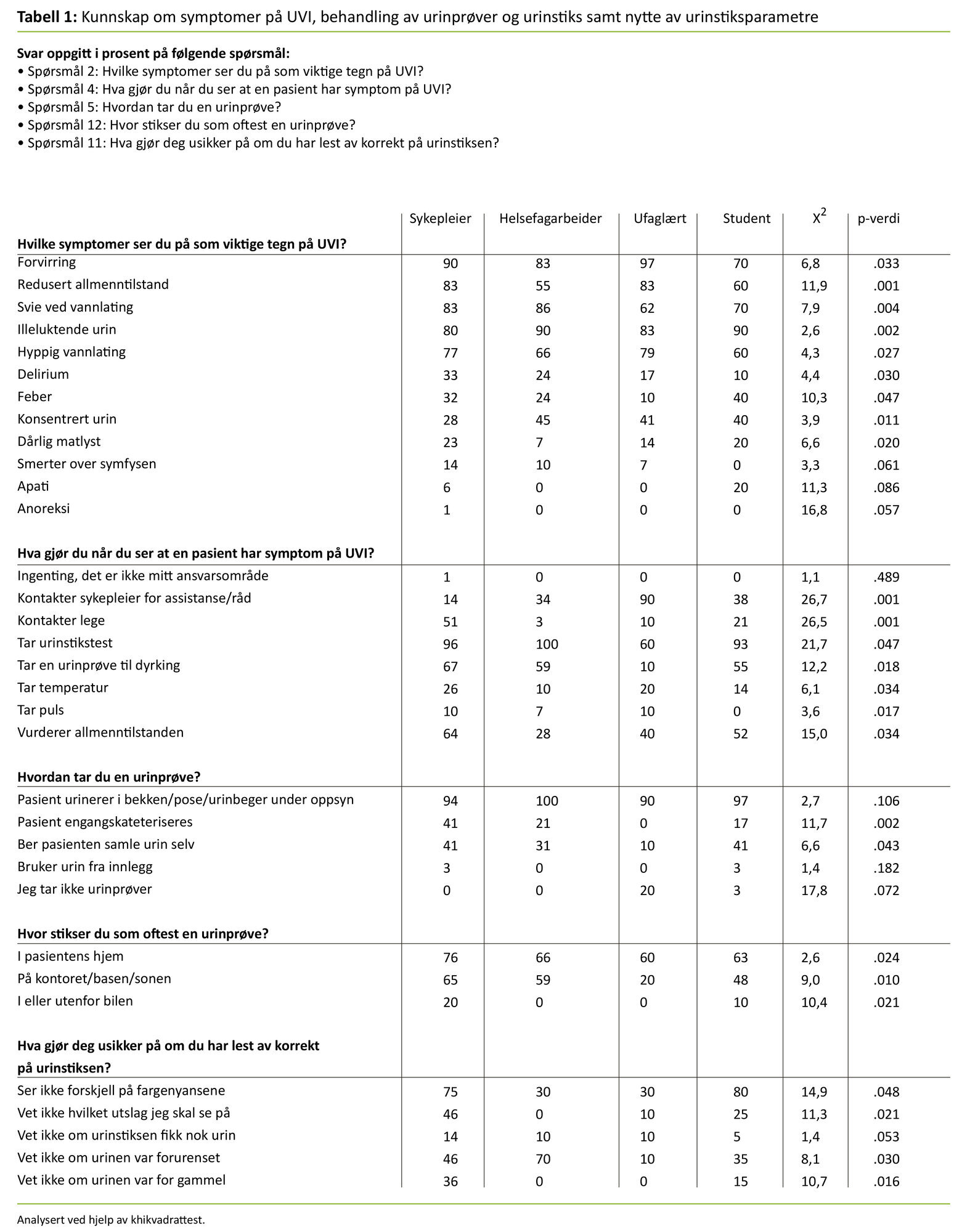 Spørsmål 4 «Hva gjør du når du ser at en pasient har symptom på UVI?» har til hensikt å kartlegge hvorvidt helsepersonellet kan handle adekvat på symptom på UVI. Resultatene fra spørsmål 4 (se tabell 1) viser at de aller fleste opplever UVI som sitt ansvarsområde, det vil si at helsefagarbeidere (34 prosent), studenter (38 prosent) og ufaglærte (90 prosent) kontakter sykepleier og ber om assistanse eller råd om hvordan de skal gå frem. Halvparten av sykepleierne oppgir at de kontakter lege, mens de aller fleste (med unntak av 40 prosent av de ufaglærte) tar en urinstiks når de ser at en pasient har tegn på UVI.