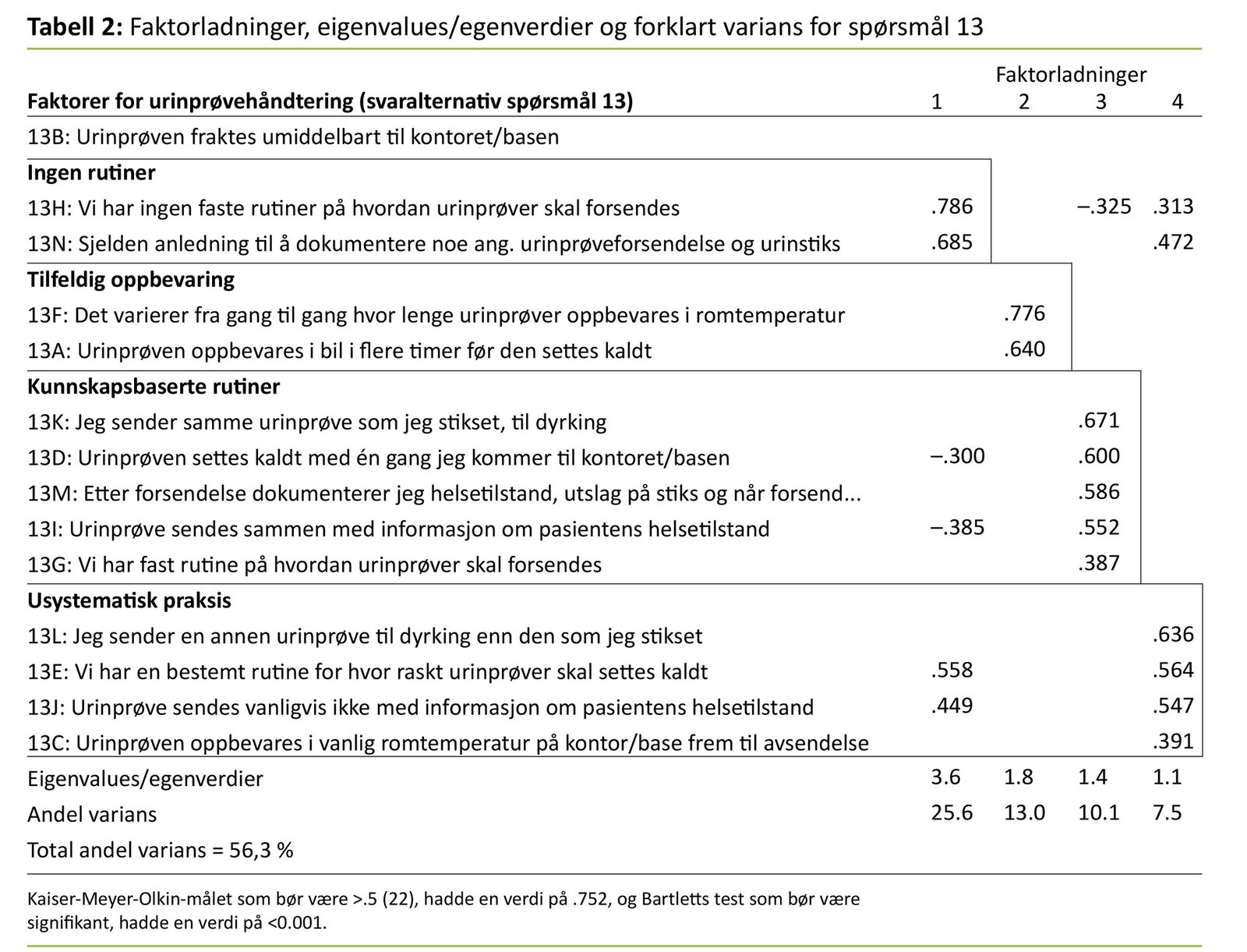 Spørsmål 13 lyder som følger: «Hvis du tar en urinprøve for dyrkning (for å sende til lege/laboratoriet), hvilke av de foreslåtte alternativene er gjenkjennbare for deg i din arbeidshverdag?» Faktoranalysen av svarene på dette spørsmålet ga fire faktorer som vi har gitt følgende navn: «ingen rutiner», «tilfeldig oppbevaring», «kunnskapsbaserte rutiner» og «usystematisk praksis». Tabell 2 viser resultatene fra faktoranalysen (20). Analyser av forskjellene mellom yrkesgruppene på de fire faktorene for urinprøvehåndtering viste at sykepleierne skårte høyest av yrkesgruppene på faktor 1 (ingen rutiner) og faktor 4 (usystematisk praksis) (statistisk signifikant).