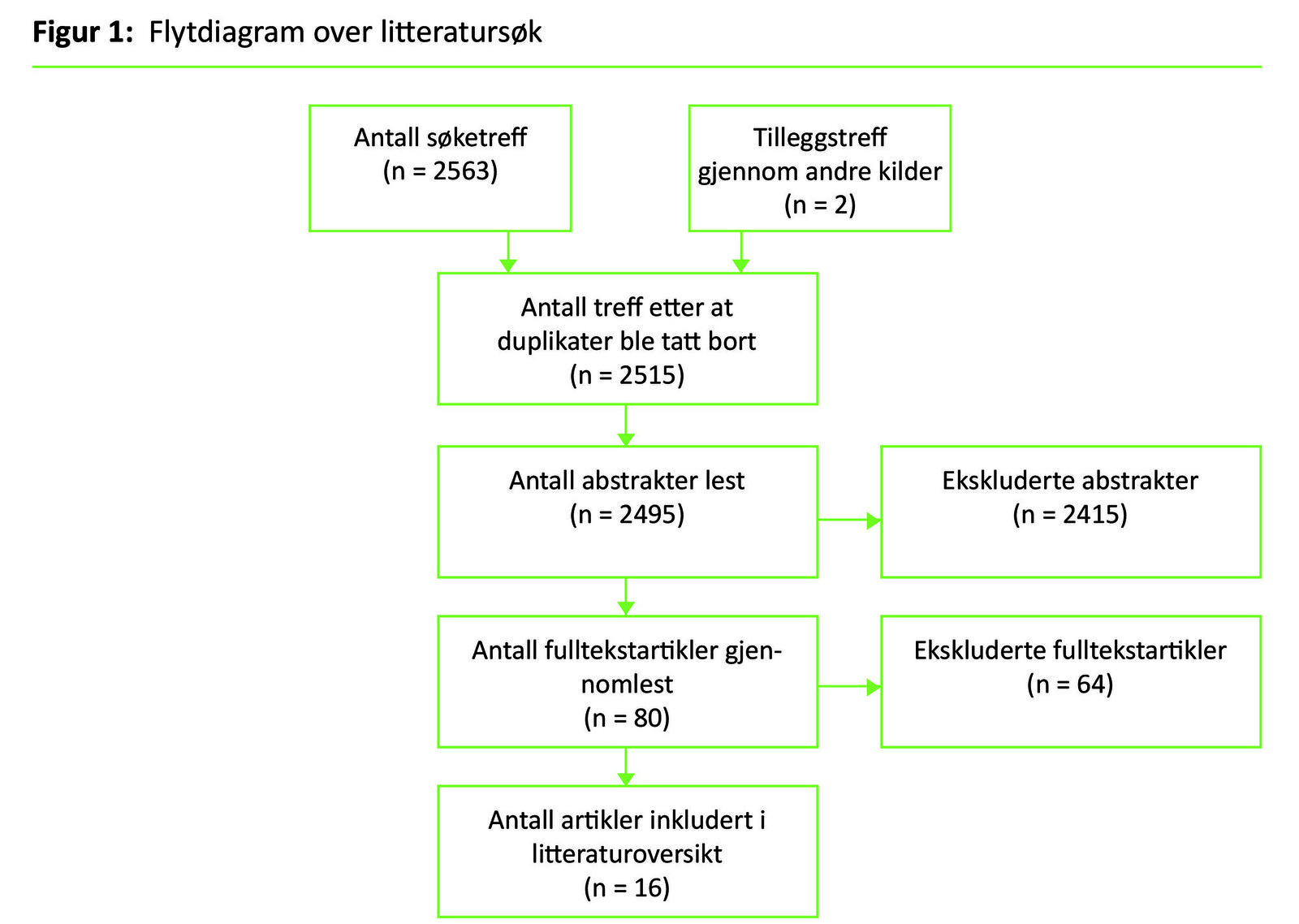 Forfatterne vurderte deretter, uavhengig av hverandre, kvaliteten på de inkluderte studiene. Med utgangspunkt i Kunnskapssenterets håndbok (16) ble studiene vurdert opp mot sjekklister som var spesifikke for studier med ulik design. I alt 16 studier tilfredsstilte inklusjons- og kvalitetskriteriene og ble inkludert i oversikten (figur 1).