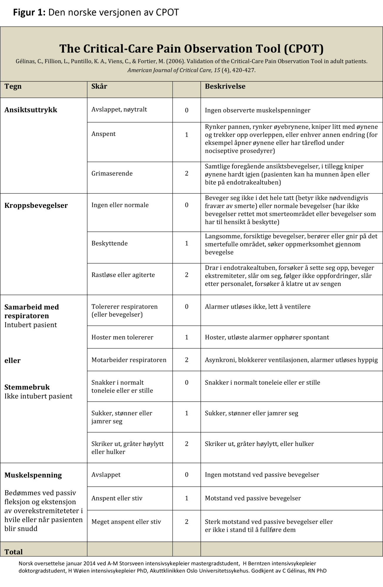 Hensikt: Å oversette The Critical-Care Pain Observation Tool (CPOT) og undersøke verktøyets validitet og reliabilitet.
