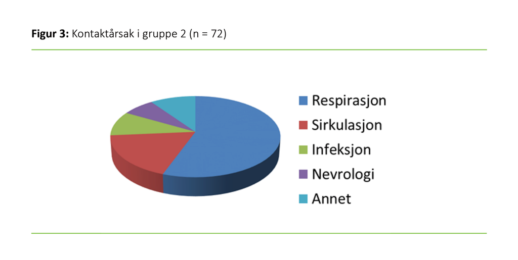 På registreringsskjemaet var årsaken til tilkalling av MIS enten spesifisert som en diagnose (eksempelvis pneumoni, sepsis, hypotensjon) eller som fritekst med beskrivelse av problemet. Vi redefinerte disse årsakene etter faktisk pasientproblem samt kliniske funn notert på skjemaet og kom frem til følgende kontaktårsaker: