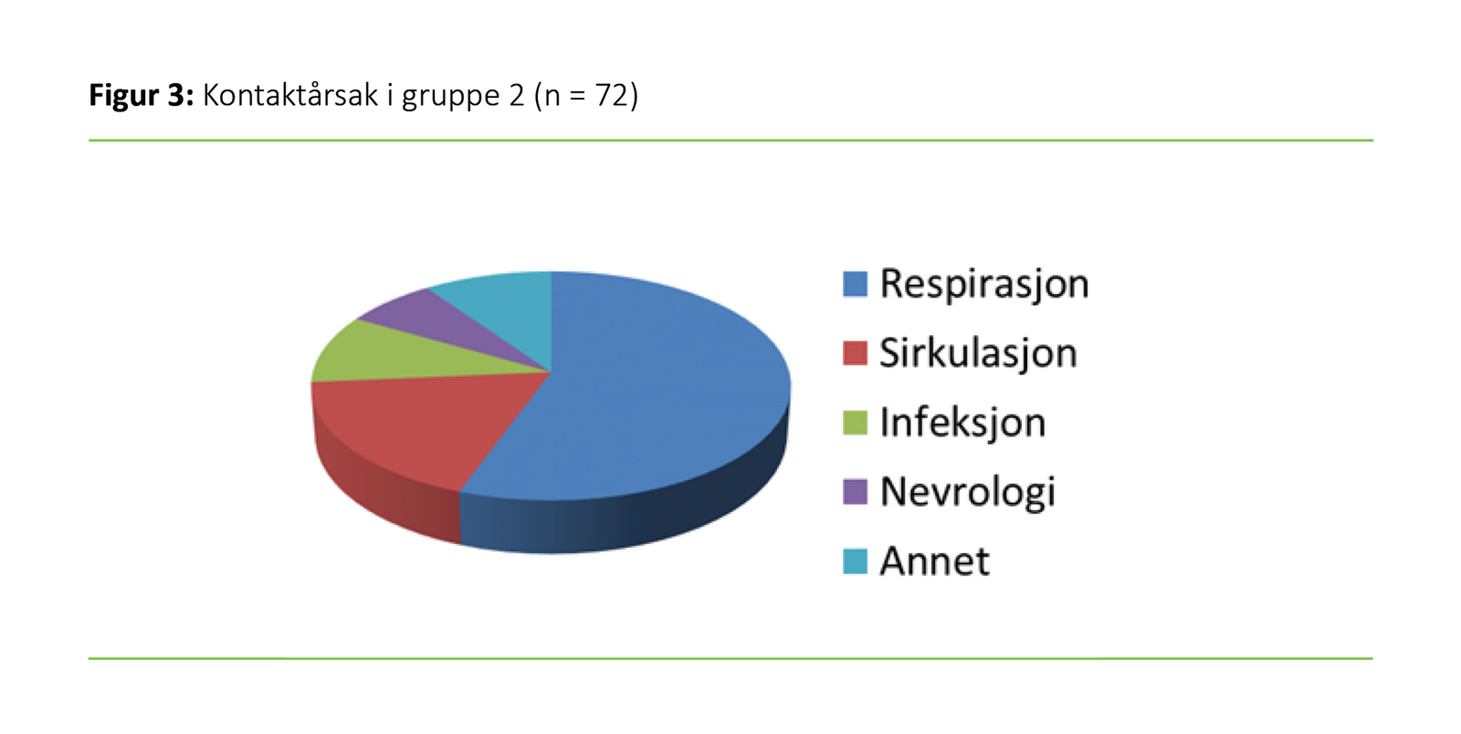 Dersom MIS ble tilkalt til en pasient med lav oksygenmetning i blodet og rask respirasjonsfrekvens, som igjen utløste høy NEWS-skår, ble det registrert som respiratorisk kontaktårsak. Enkelte pasienter hadde få avvik på NEWS-skår. Disse kunne derimot ha isolert skår på «bevissthet», noe som ble klassifisert som nevrologisk kontaktårsak. Andre tilstander som ble notert på skjemaet, som hyperglykemi, anafylaksi, hypotermi og urinretensjon, fremkom bare en sjelden gang. Disse tilstandene samlet vi i gruppen «annet». I overkant av halvparten av MIS-tilkallingene var forårsaket av respiratoriske problemer (n = 41; 56,9 prosent) etterfulgt av sirkulatoriske problemer (n = 13; 18,1 prosent). Figur 3 viser fordelingen for øvrige årsakskategorier.