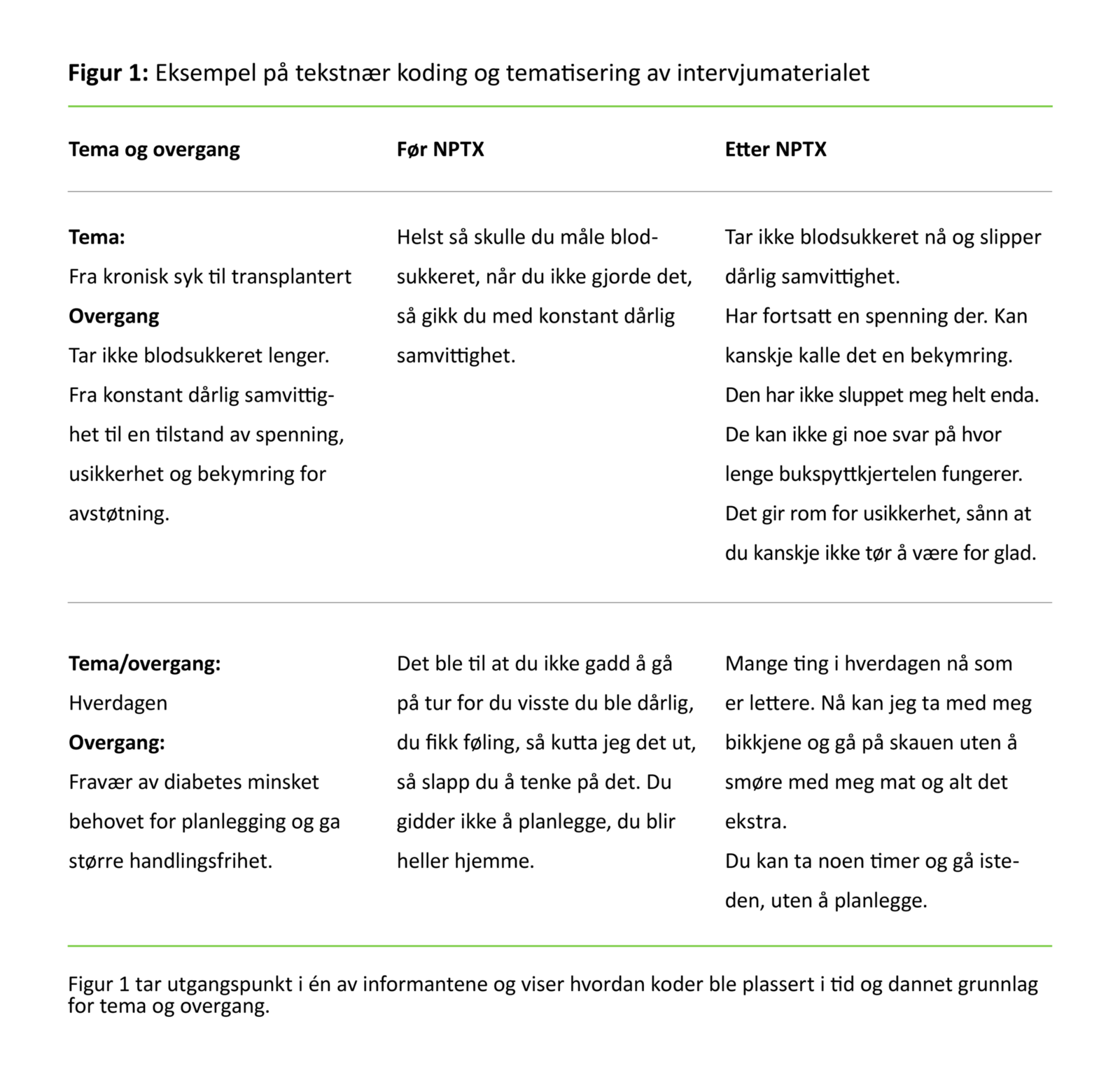 Vi brukte Tjoras (13) stegvise deduktive–induktive (SDI) metode i analysen. Metoden ble valgt fordi den er tekstnær og det var et mål at resultatene skulle være så tro mot deltakernes beskrivelser som mulig. I analysen brukte vi informantens ord og uttrykk til å kode induktivt fra datamaterialet. Deretter kategoriserte vi kodene i tid før og etter transplantasjonen slik at overgangene ble lettere å identifisere. Kodene ble deretter kategorisert i tema og overganger, som igjen ga grunnlag for hovedtemaene som presenteres i denne artikkelen (se figur 1).