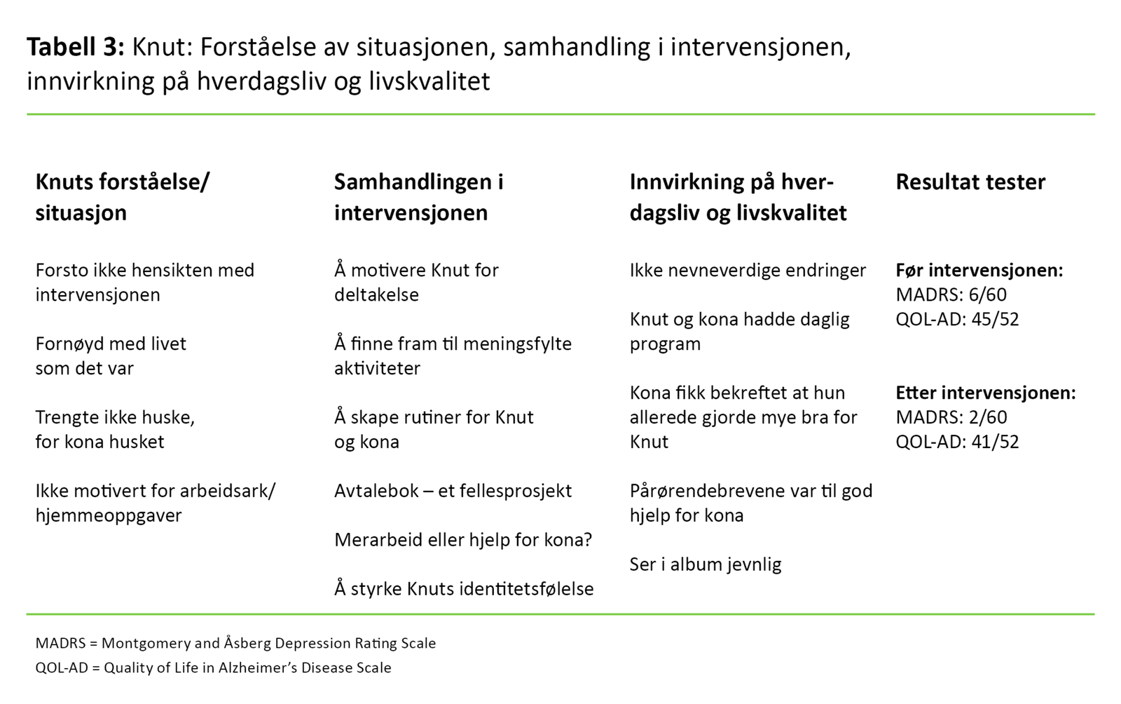 For Knut førte intervensjonen ikke til endringer, noe som gjenspeiles i MADRS (10) og QOL-AD (11) (tabell 3). Ektefellen syntes det var fint å høre at hun allerede gjorde mye bra for mannen sin, og få bekreftet at det var naturlig å bli både irritert og lei av og til.
