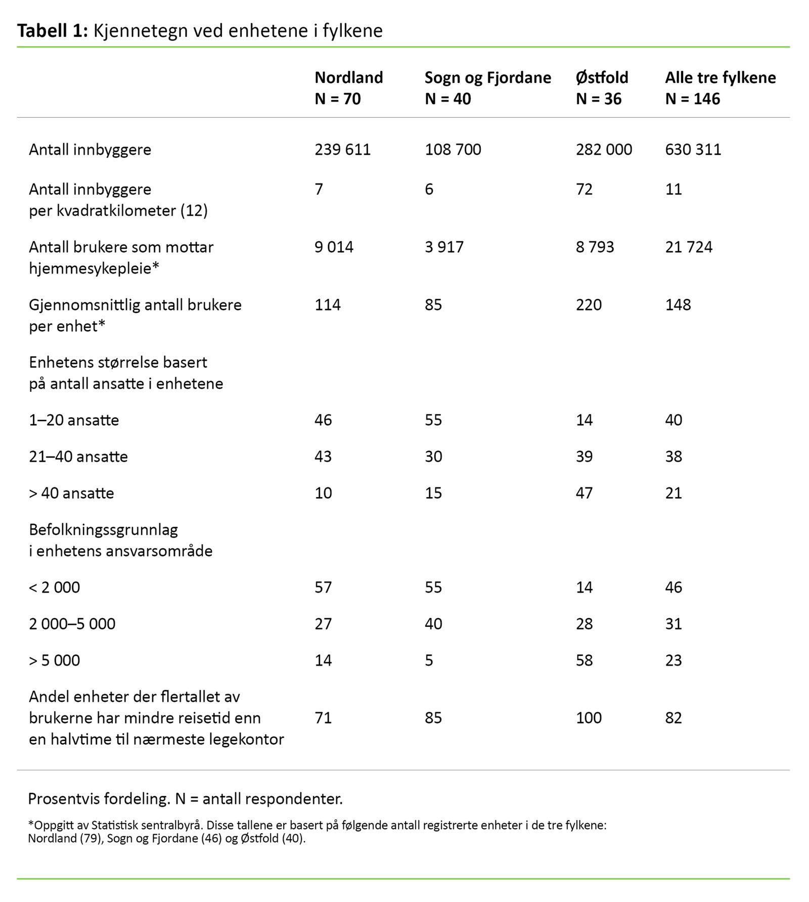 Tabell 1, kjennetegn ved enhetene i fylkene, viser at Sogn og Fjordane har langt færre brukere som mottar hjemmesykepleie enn Nordland og Østfold. Hver enhet i Østfold har nesten tre ganger så mange brukere som enhetene i Sogn og Fjordane og nesten dobbelt så mange som enhetene Nordland.