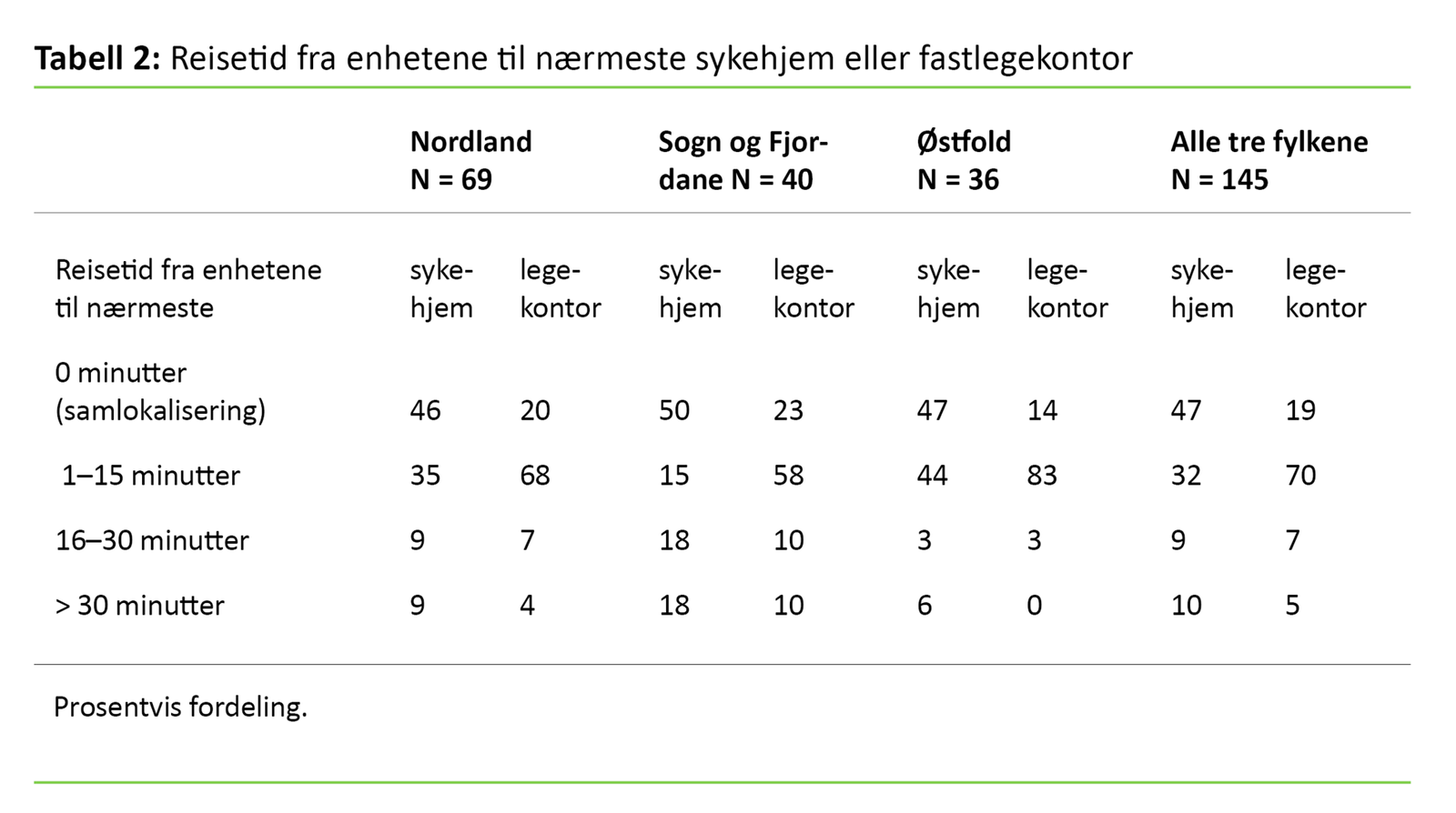 Tabell 2 viser målt reisetid fra enhetene til nærmeste sykehjem og nærmeste legekontor i minutter. Totalt var 47 prosent av hjemmetjenesteenhetene samlokalisert med et sykehjem, mens 19 prosent var samlokalisert med et legekontor (tabell 2).