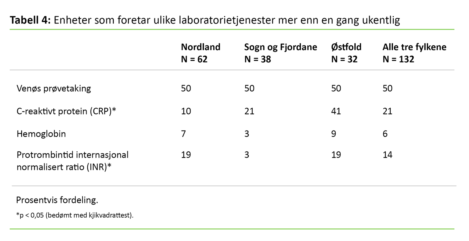 Tabell 4 viser at halvparten av enhetene i alle fylkene utførte venøs prøvetaking mer enn én gang i uken, mens andelene er langt lavere og varierer for de resterende tre analysetypene, mellom 6 og 21 prosent. Andelen som analyserte CRP, er signifikant forskjellig mellom fylkene.
