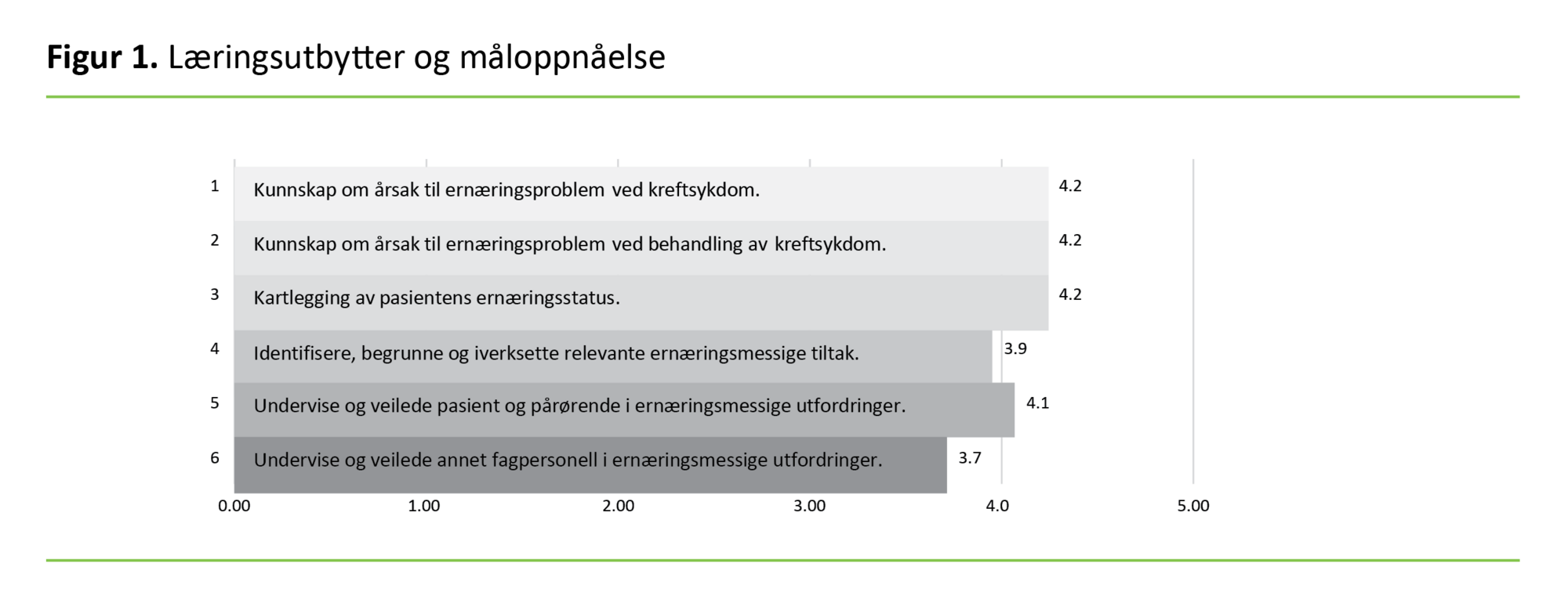 Del 1. Læringsutbytter i ernæring og grad av måloppnåelse. Gjennomsnittlig score for oppnåelsen av læringsutbytter er 4,1 som er et meget godt resultat. Kunnskap om årsaker til ernæringsproblem, kartlegging av ernæringsstatus og undervisning/veiledning av pasient og pårørende fikk høyest score.