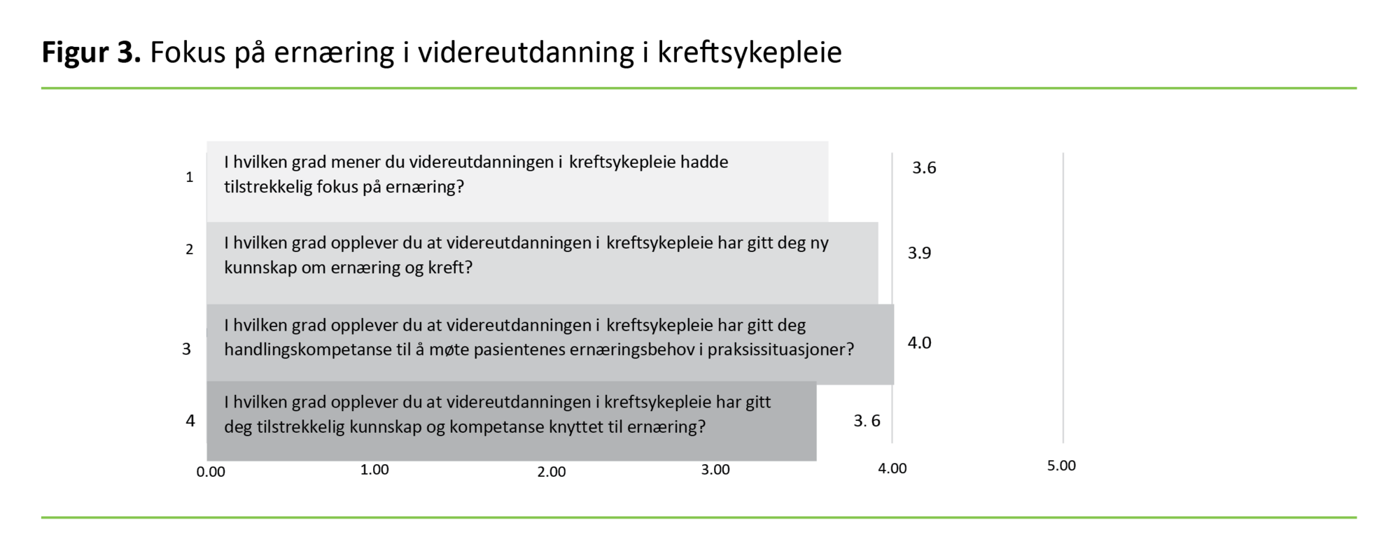 Studien angir altså god score for måloppnåelse av læringsutbytter, men lavere score på om de har tilstrekkelig kompetanse i ernæring. Dette fremkommer om man ser figur 1 og 3 i sammenheng. Det kan handle om at praksisfeltet byr på utfordringer som en videreutdanning ikke har mulighet å forberede studentene på. Det kan også innebære at læringsutbyttene ikke i tilstrekkelig grad ivaretar behov i praksisfeltet eller at vurderingen av utbytte ikke gir et korrekt bilde av kompetanse.
