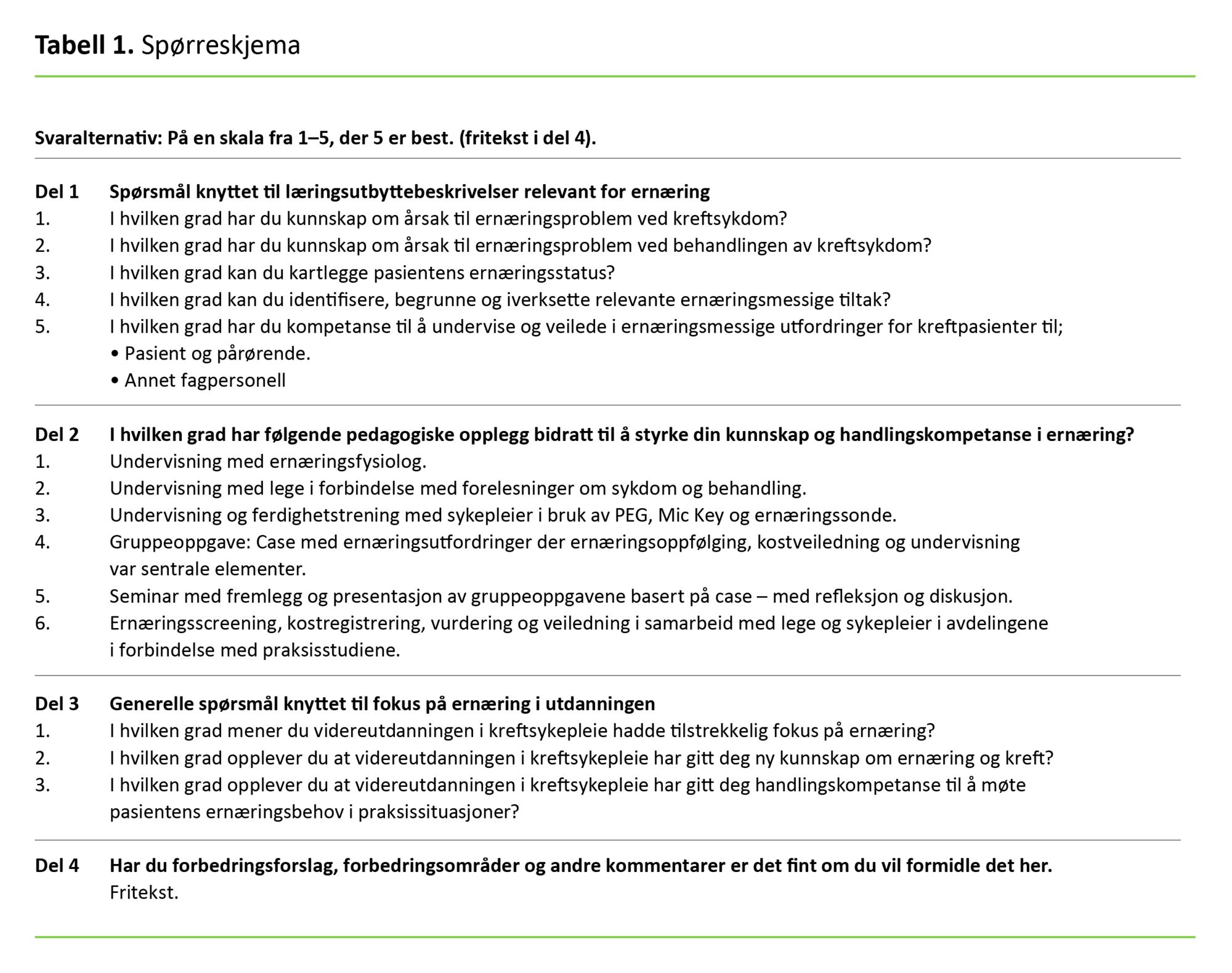 Spørreskjemaet (tabell 1) ble utviklet ut fra innholdet i fagplanen (5) og undersøkelsen ble gjort i programmet Questback. Spørreskjemaet hadde fire hoveddeler med 4–6 spørsmål i del 1–3. Svaralternativene ble gitt i en skala fra 1–5, der 5 var best. Del 4 ga rom for fritekst.