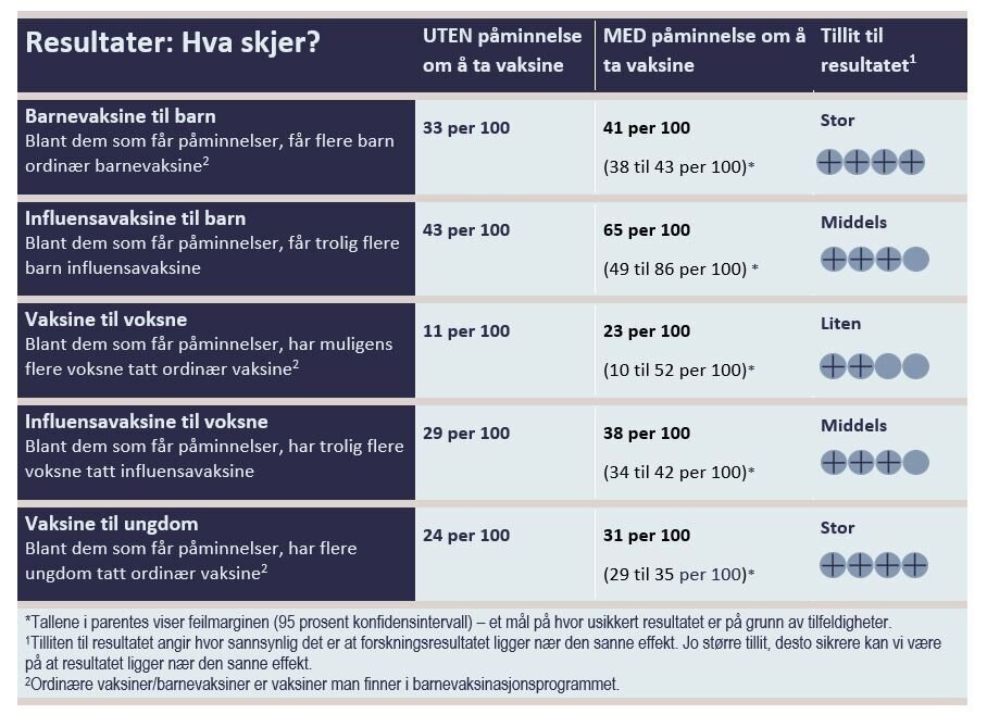 - trolig fører til at flere voksne tar influensavaksine (middels tillit til resultatet)