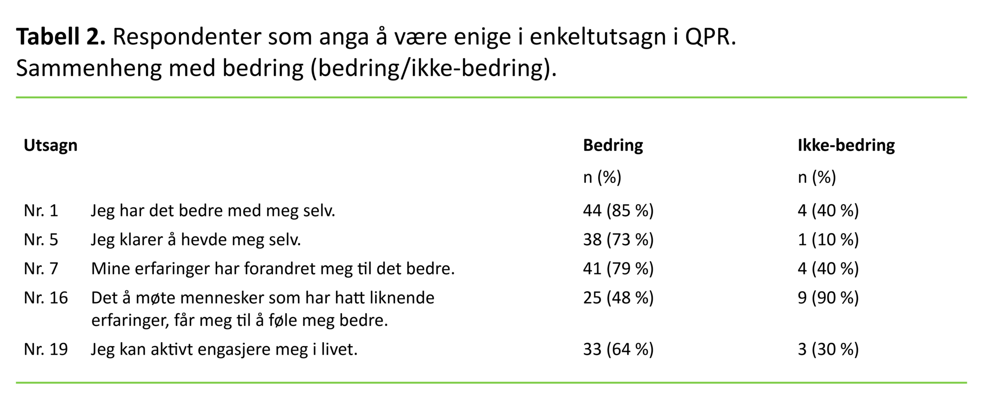 Fem spørsmål i spørreskjemaet QPR skilte signifikant mellom gruppen som anga å være i bedring, og gruppen som ikke var i bedring, se tabell 2.