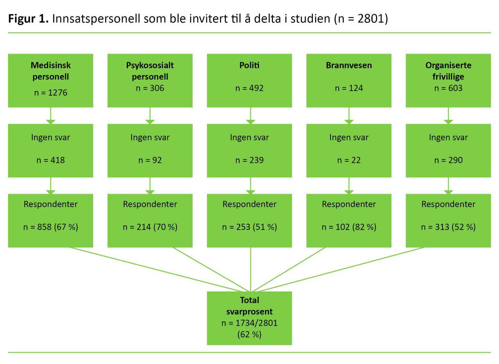 I alt sendte vi ut 2801 spørreskjemaer og fikk i retur 1734 skjemaer (62 prosent). Svarprosenten varierte fra 82 for brann- og redningsetaten til 51 for organiserte frivillige (figur 1).