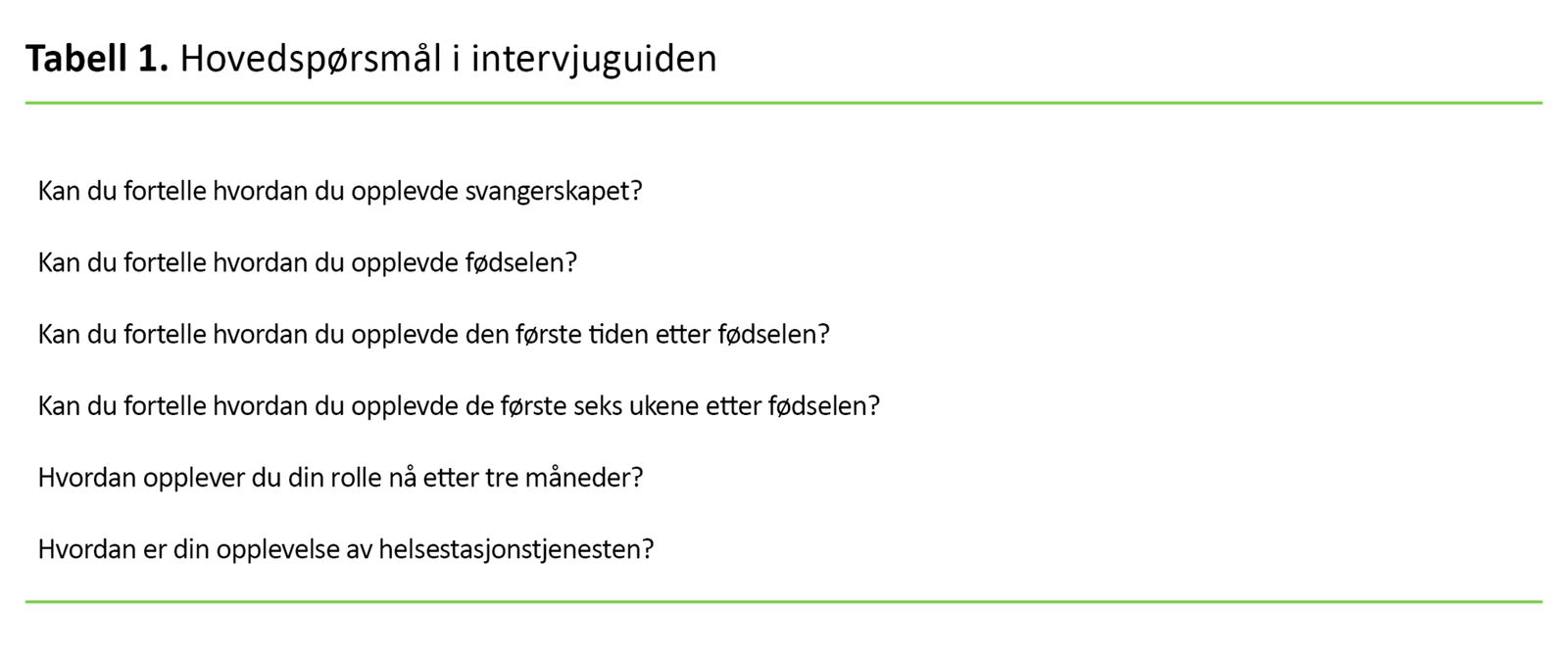 Førsteforfatteren gjennomførte intervjuene. Intervjuene hadde utgangspunkt i en semistrukturert intervjuguide som besto av totalt seks åpne hovedspørsmål med utdypende oppfølgingsspørsmål (tabell 1). Alle hovedspørsmålene hadde forankring i forskningsspørsmålet (14).