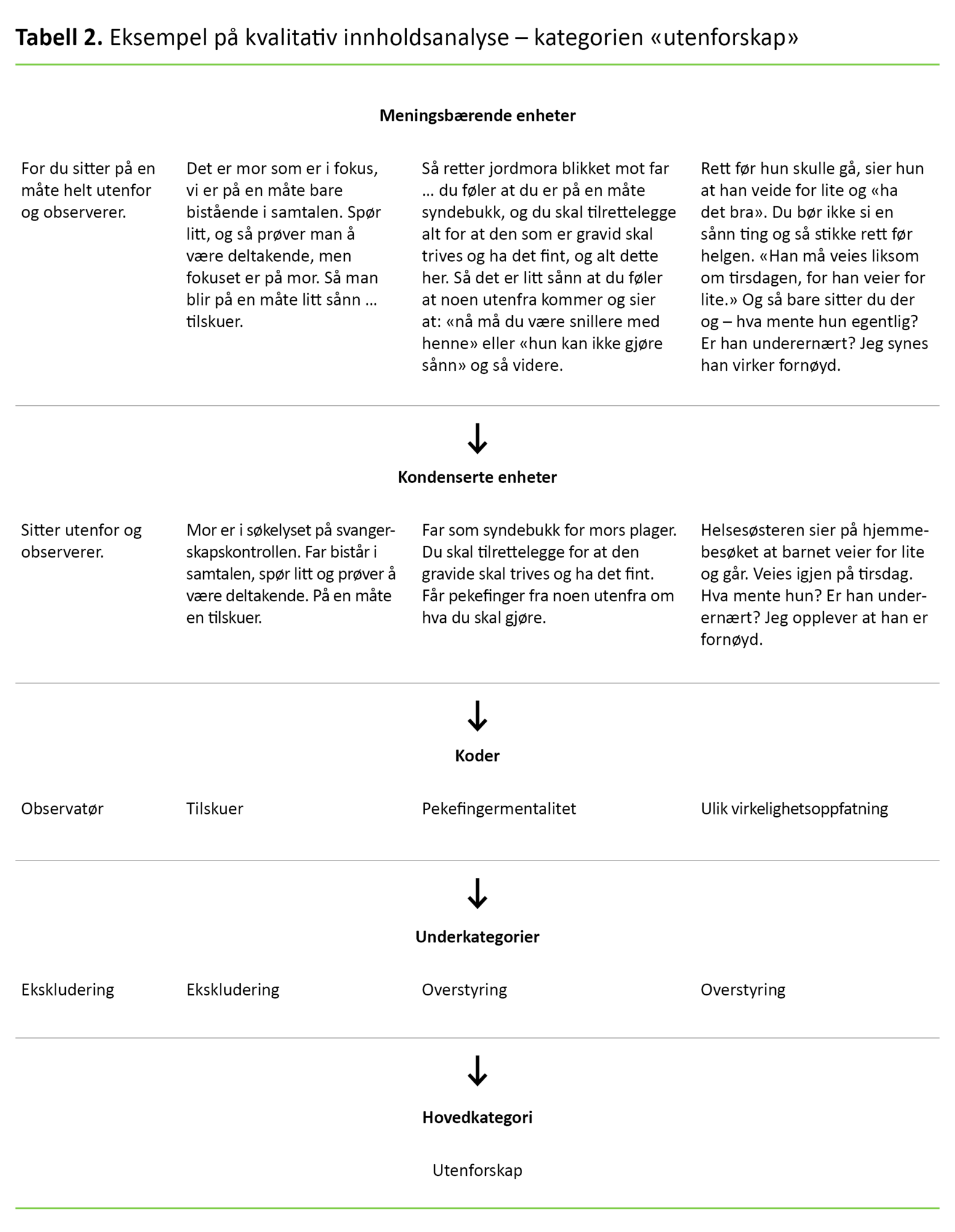 Analysen følger Graneheim og Lundmans kvalitative innholdsanalyse (16). Metoden er egnet til å analysere kvalitative data der hensikten er å beskrive informantenes opplevelser. Analysemetoden omfatter datamaterialets manifeste og latente innhold og har en induktiv tilnærming. Det manifeste innholdet utgjør informantenes direkte utsagn. Det latente er det som sies implisitt, og som innebærer rom for fortolkning. Analysen var en stegvis prosess gjennom fem trinn. Alle intervjuene ble først gjennomlest, og meningsbærende enheter identifisert. Deretter kondenserte og kodet vi enhetene. Vi sorterte og samlet kodene i underkategorier og deretter kategorier (tabell 2).
