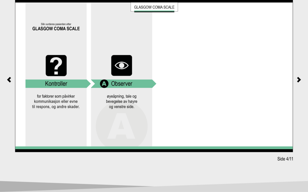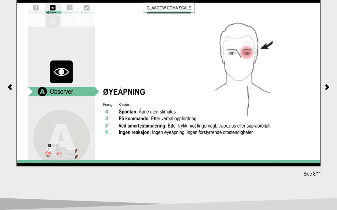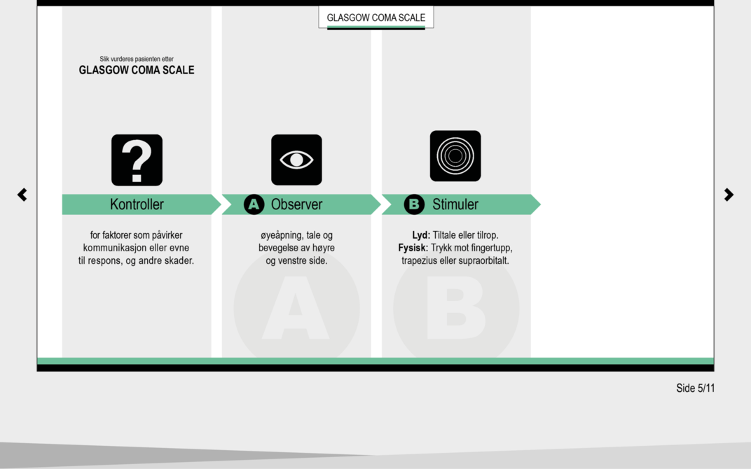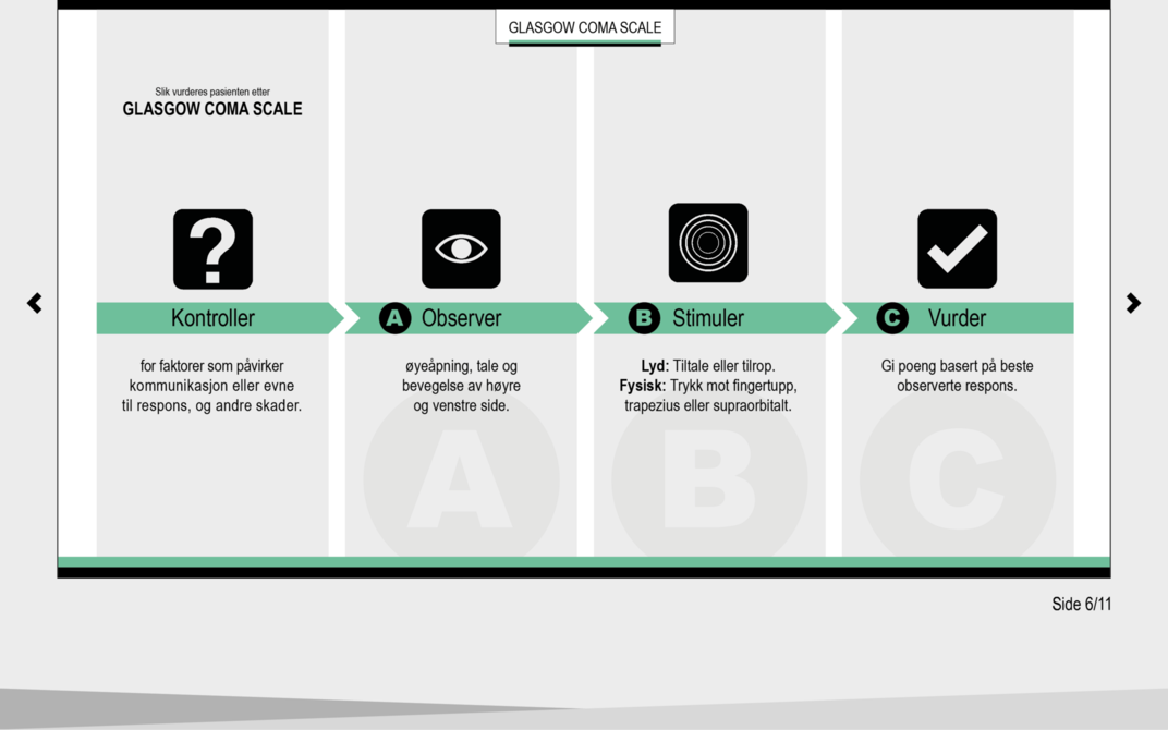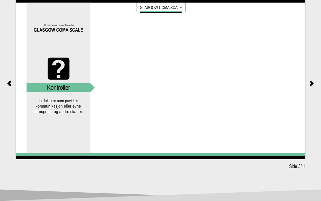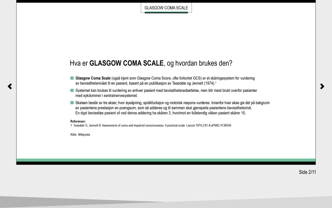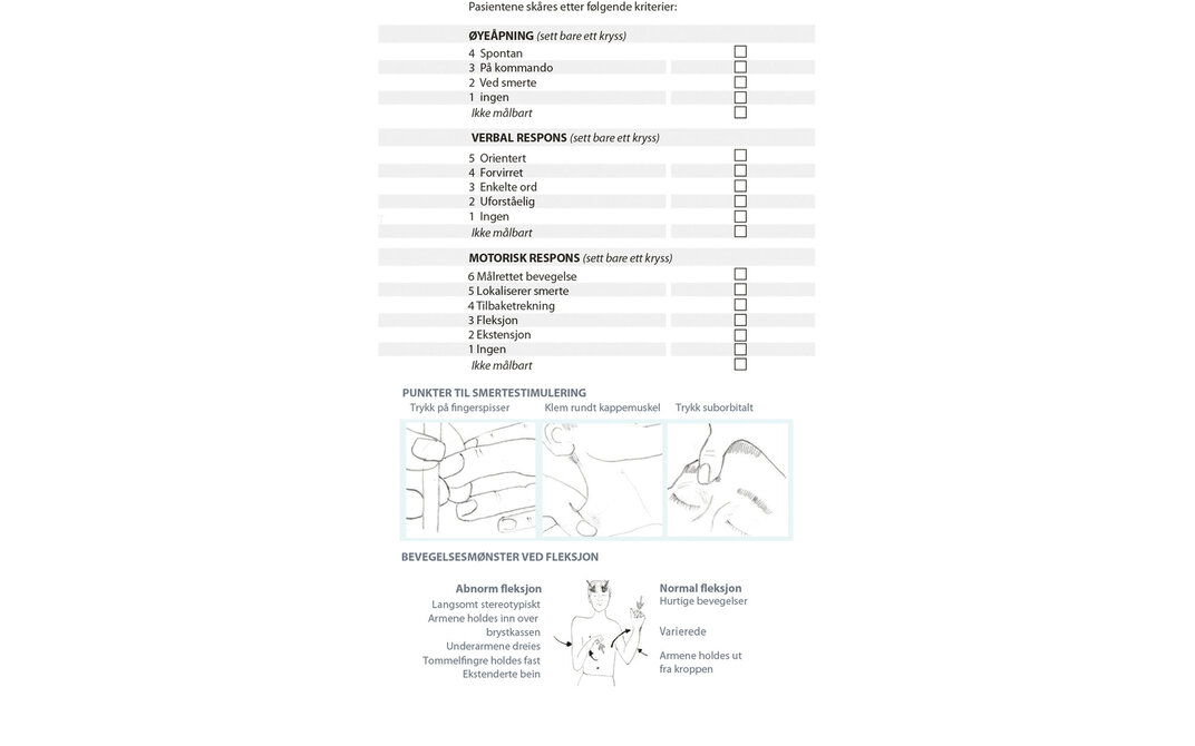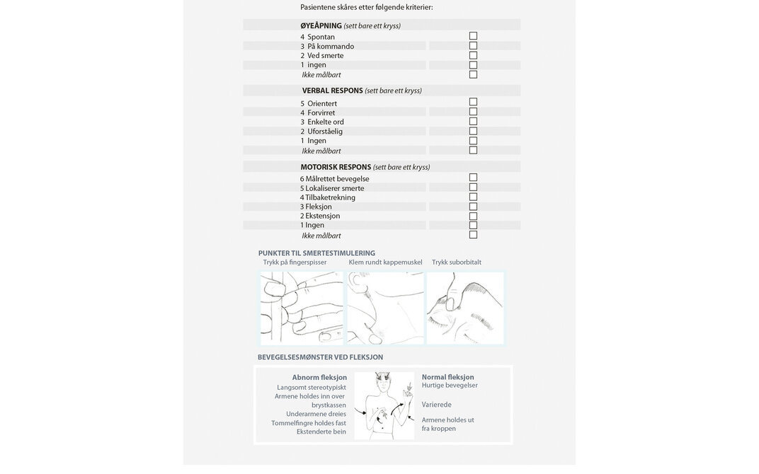 Glasgow Coma Scale (GCS) ble utviklet i 1974 som et klinisk verktøy for å fastslå, beskrive og måle grad av bevissthet hos postoperative pasienter på en systematisk måte (6). GCS brukes for å overvåke pasientens bevissthetsnivå og observere og dokumentere eventuelle forandringer i bevissthetsnivået over tid. Skalaen brukes videre som grunnlag i vurderingen av graden av intoksikasjon, antatt rekonvalesenstid og som indikasjon på behov for intubasjon (7).