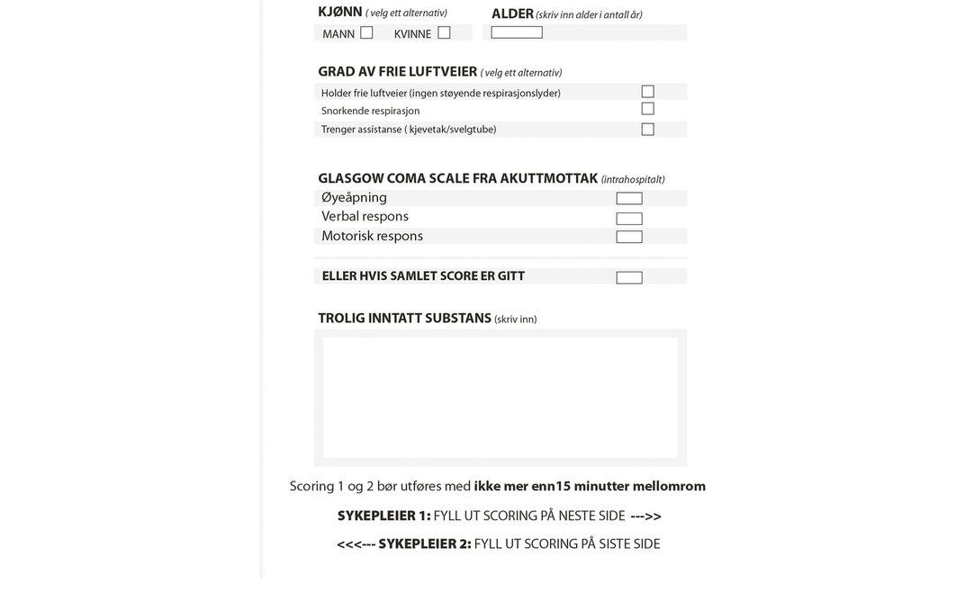 Sykepleierne kunne ikke se hverandres skåringer. Hver sykepleier skåret pasienten med så kort tidsintervall som mulig. På skjemaet ble det også angitt mistenkt substans som forårsaket forgiftningen, pasientens alder og kjønn, GCS-skår i akuttmottaket og om pasienten hadde frie luftveier ved ankomst.