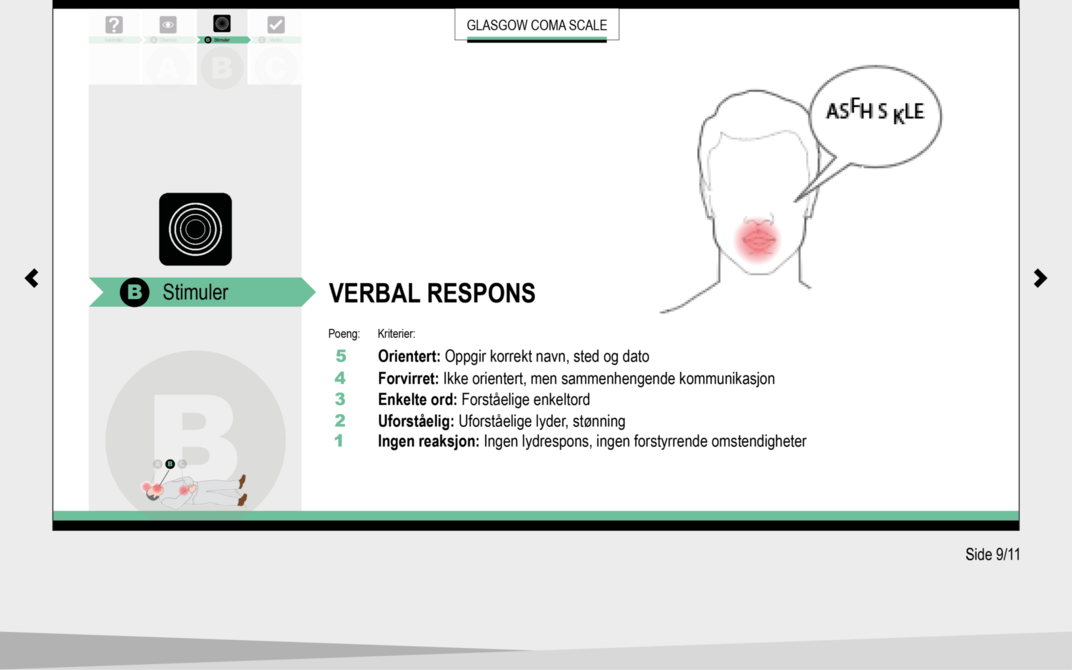 En annen feilkilde kan være personalets tolkning av den verbale komponenten i GCS. Sykepleiernes tolkning av hva som oppfattes som henholdsvis orientert, forvirret og uforståelig tale (se skåringsskjema gjengitt som vedlegg 1), kan være subjektiv (20). Det var likevel skåringen av verbal respons som ga høyest samsvar i undersøkelsen.