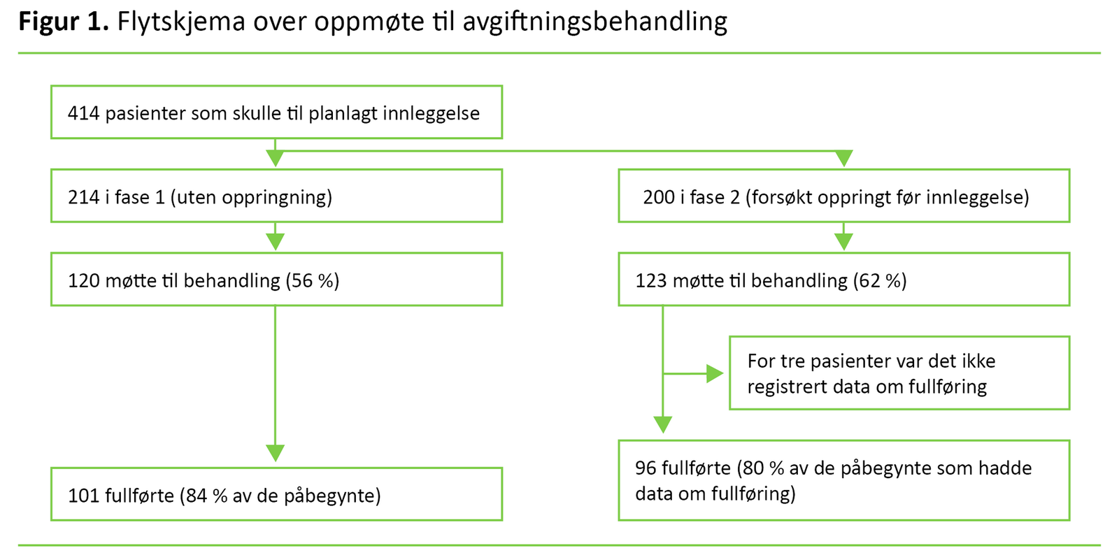 Det var 41 prosent av pasientene som ikke møtte til behandling. Tilsvarende tall fra to avgiftningsenheter ved Universitetssykehuset Nord-Norge viser en ikke-møtt-prosent på henholdsvis 33 og 30 prosent (8). Den høye andelen av pasienter som ikke møtte, viser at temaet i studien vår er svært aktuelt.