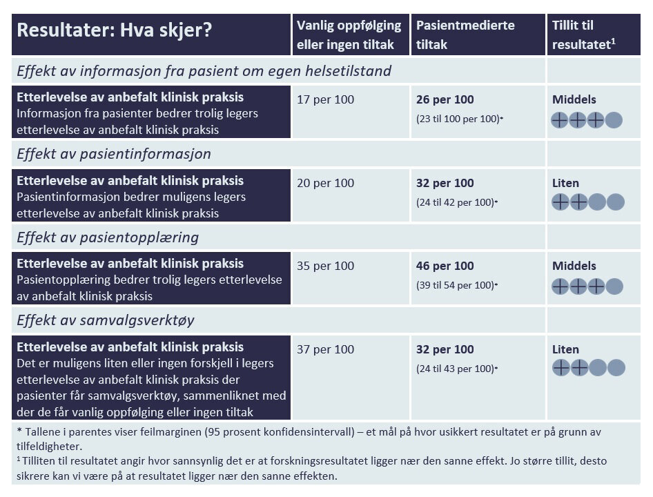 - informasjon fra pasienter om egen helsetilstand trolig bedrer legers kliniske praksis (middels tillit til resultatet)
