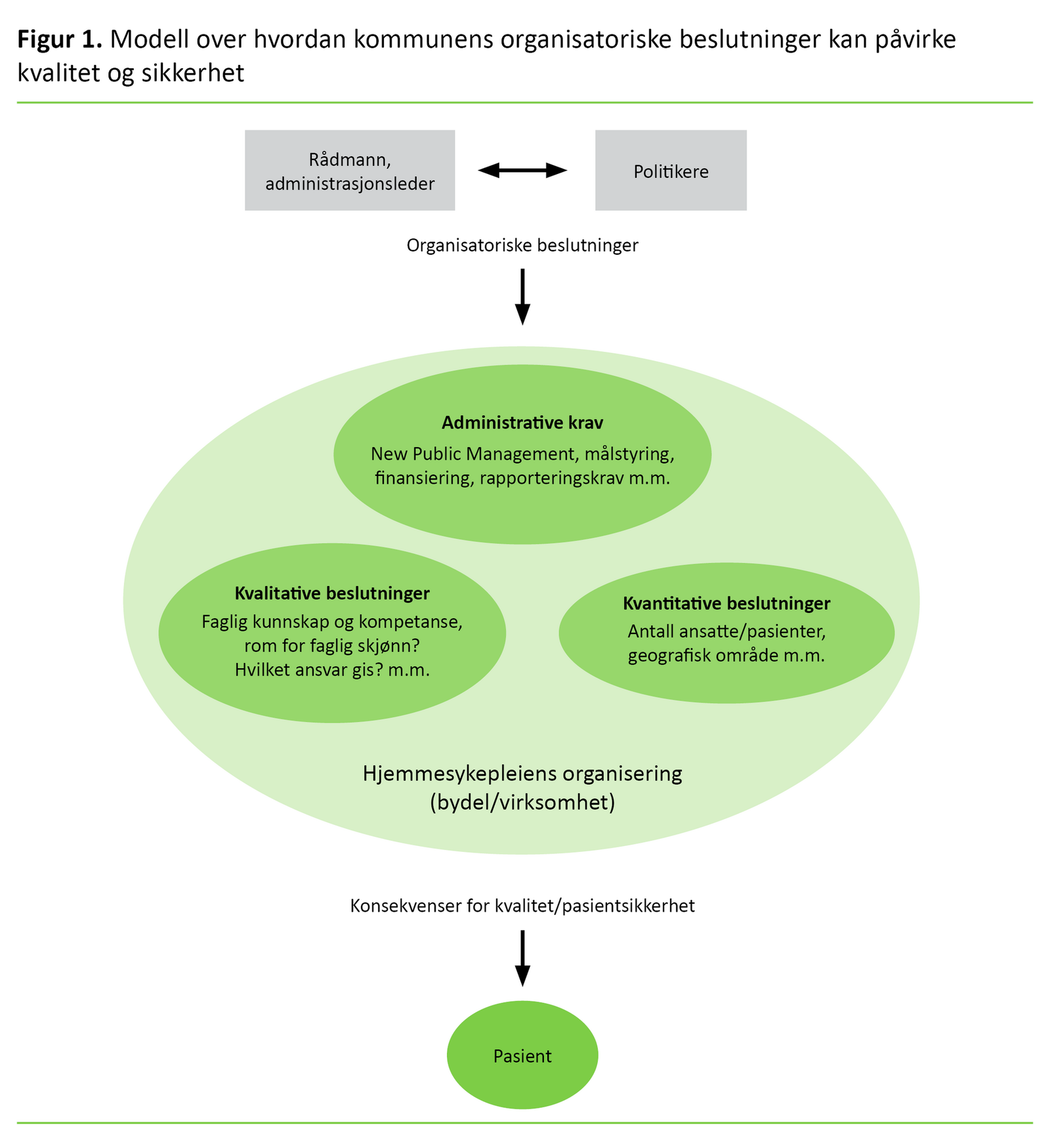 Hvordan Kommune-Norge organiserer hjemmesykepleien har betydning for både kvaliteten og pasientsikkerheten. Tjenester av god kvalitet forstås i denne artikkelen som virkningsfulle, trygge og sikre tjenester som involverer brukerne og gir dem innflytelse, er samordnet og preget av kontinuitet (4). Valget av hjemmesykepleieorganisering som tas av beslutningstakere, slik som politikere og kommuneadministrasjonen, kan relateres til tre forskjellige faktorer:
