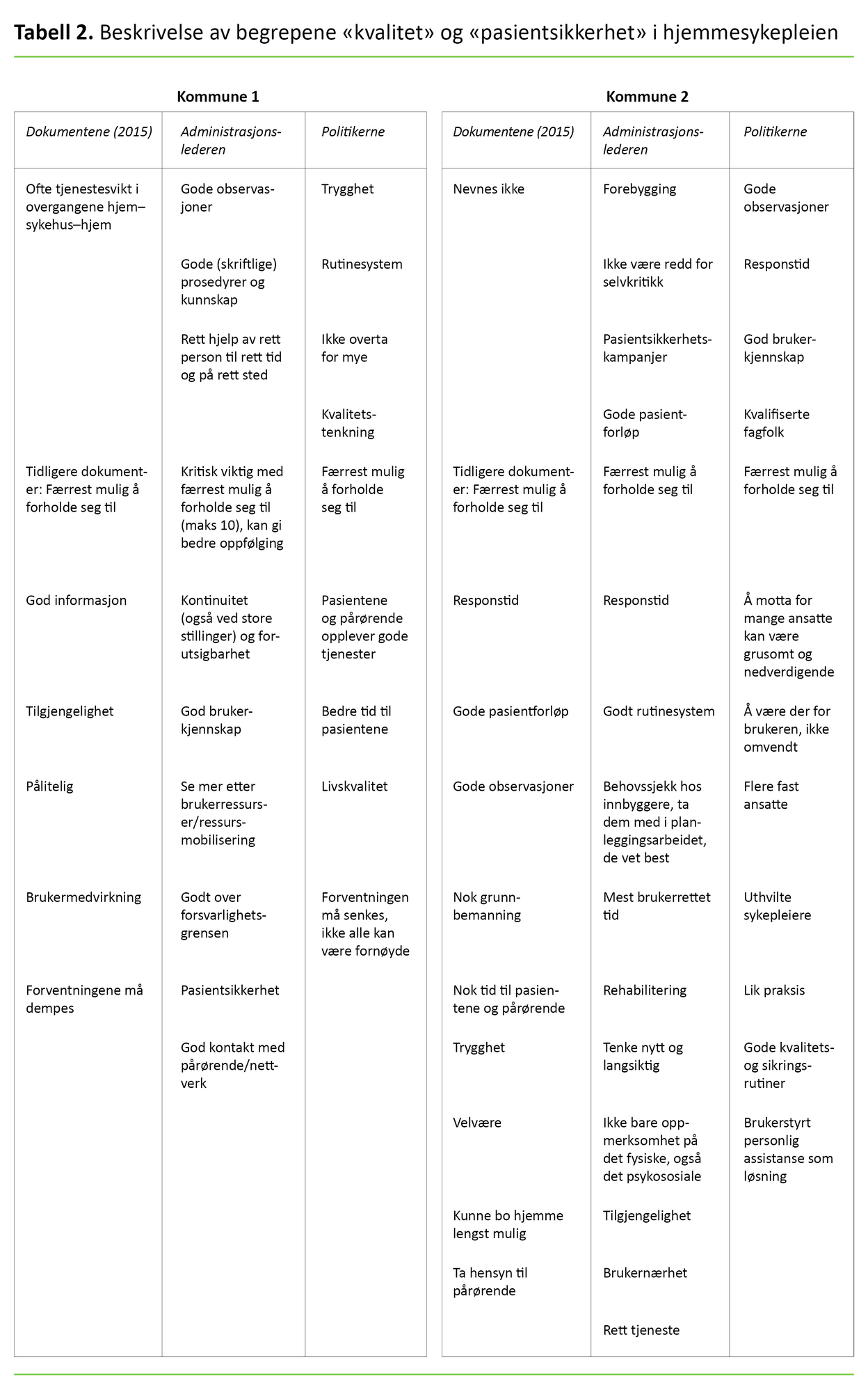 Når kvaliteten og pasientsikkerheten i hjemmesykepleien skal defineres, viser analysen av datamaterialet likheter og ulikheter hos informantene og i dokumentene fra begge kommunene (se tabell 2).