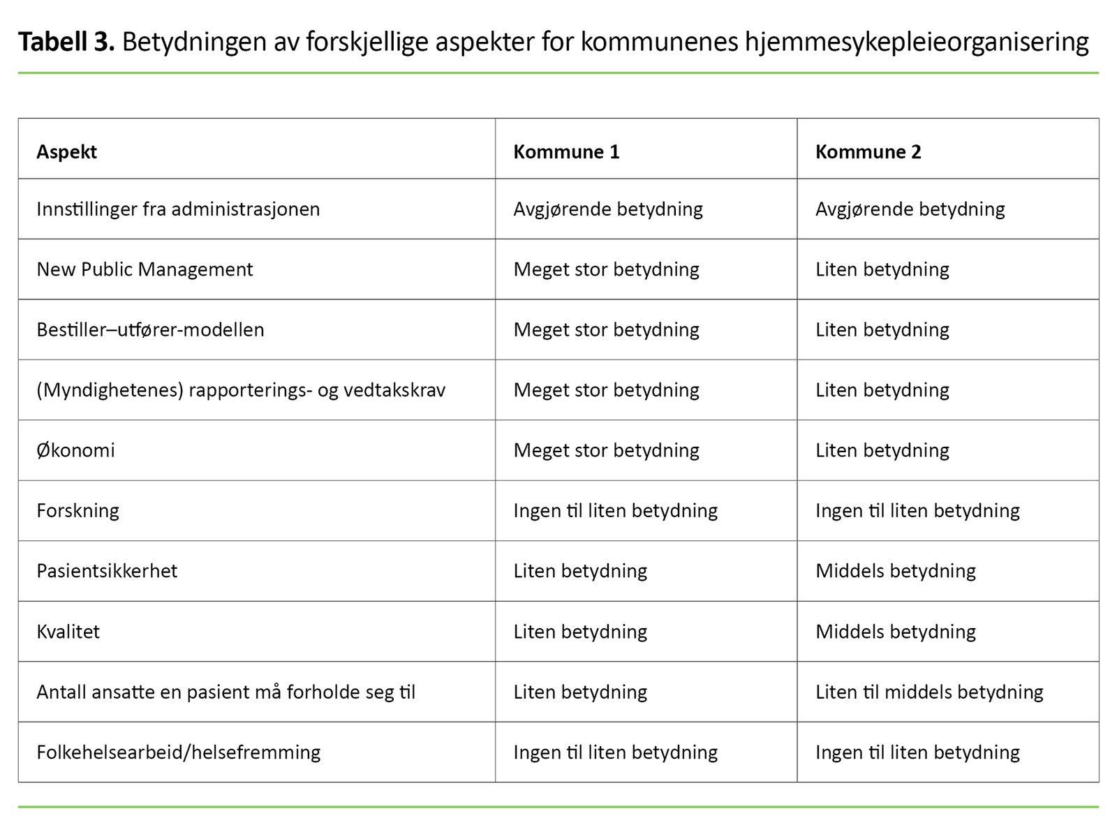 I tabell 3 viser vi en oversikt over alle faktorenes betydning for kommunenes hjemmesykepleieorganisering.