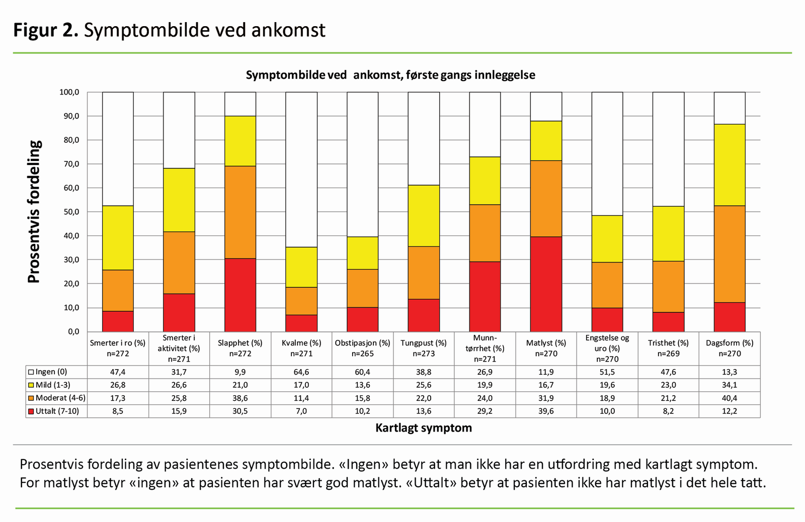 Resultat: 274 pasienter, hvorav 135 var kvinner og 139 menn, er inkludert i studien. Slapphet, munntørrhet og nedsatt matlyst fremkommer som mest belastende symptomer. Kvinner oppgir en høyere symptombelastning enn menn med unntak av symptomet tungpustethet. Det er signifikant reduksjon i alle symptomer ved utreise.