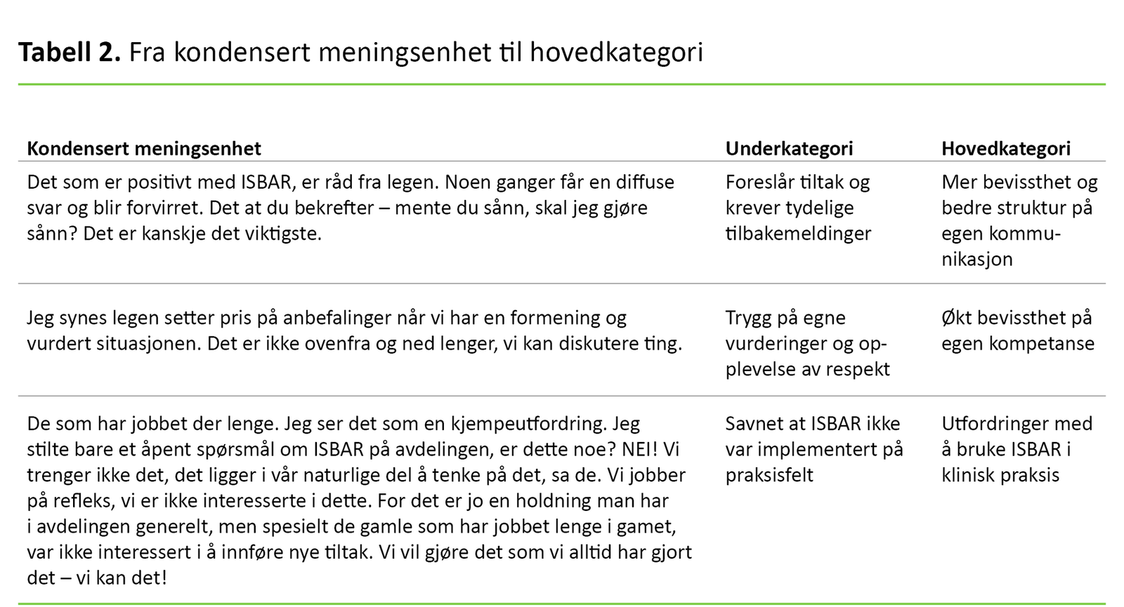Vi foretok en kvalitativ innholdsanalyse med induktiv tilnærming til datamaterialet (24). Rådata (68 sider) ble lest som helhet og delt i meningsenheter ved hjelp av NVivo 11 Pro (25). Utsagn ble kondensert og systematisert etter innhold, beskrevet og delvis fortolket til underkategorier og videre abstrahert til tre hovedkategorier (24) (tabell 2 og 3). Fortolkningen er avhengig av forskernes forforståelse (24).