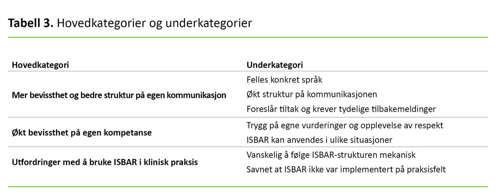 Studentene erfarte videre at ISBAR var nyttig i ulike rapportsammenhenger og i kommunikasjonen med pårørende. Det kan tyde på at studentene ubevisst har integrert ISBAR i sin yrkesutøvelse, og at de anvender ISBAR i flere situasjoner. Forskning viser at ISBAR også blir brukt i rapport- og legevisittsammenhenger (14, 15), og støtter studentenes erfaringer med at ISBAR kan anvendes i slike situasjoner.