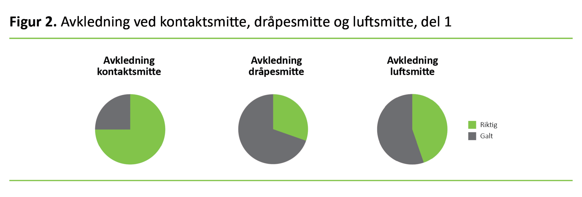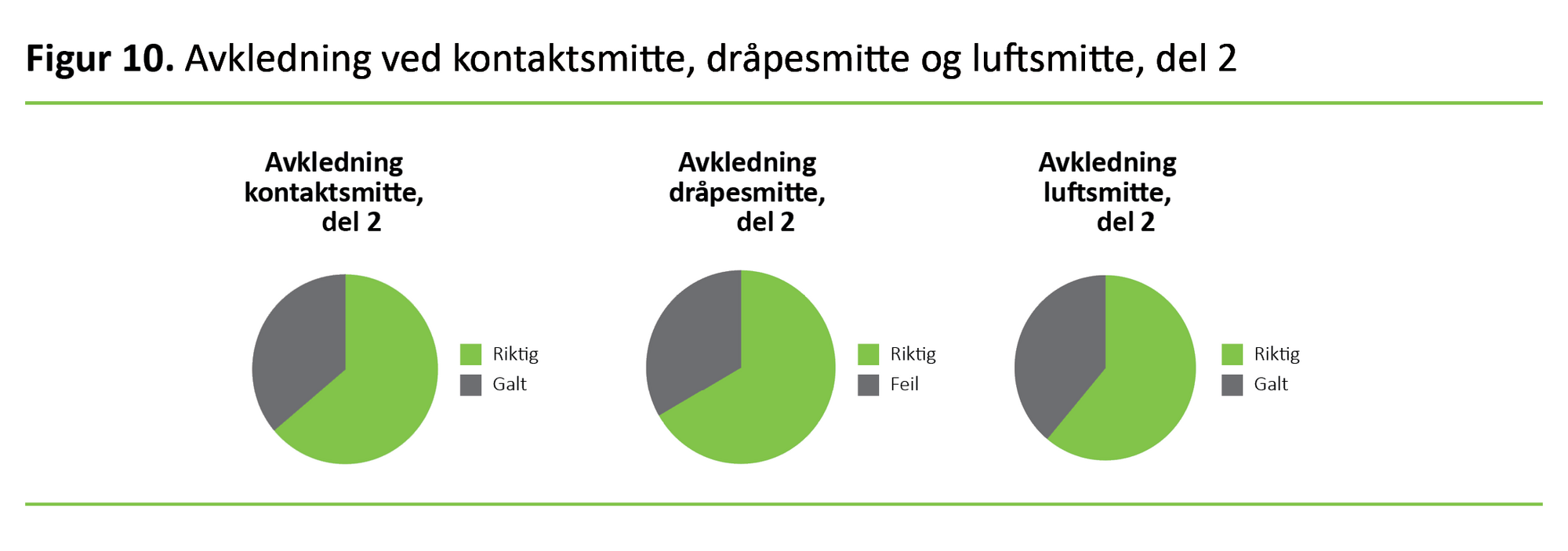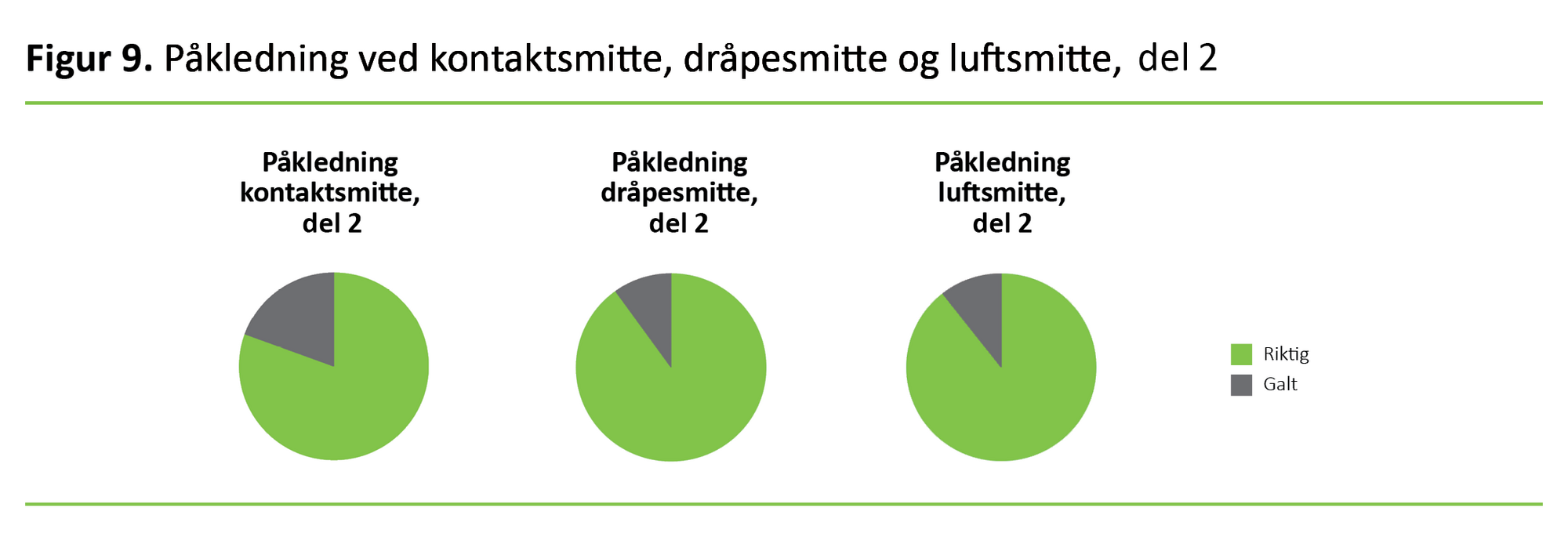 Figur 2 viser at omtrent 25 prosent av deltakerne utførte avkledning av personlig beskyttelsesutstyr i etterkant av kontakt med pasient som er kontaktsmitteisolert, i feil rekkefølge. I overkant av halvparten oppga at de ville utført samme prosedyre i feil rekkefølge i etterkant av kontakt med pasienter isolert på dråpesmitte eller luftsmitte.