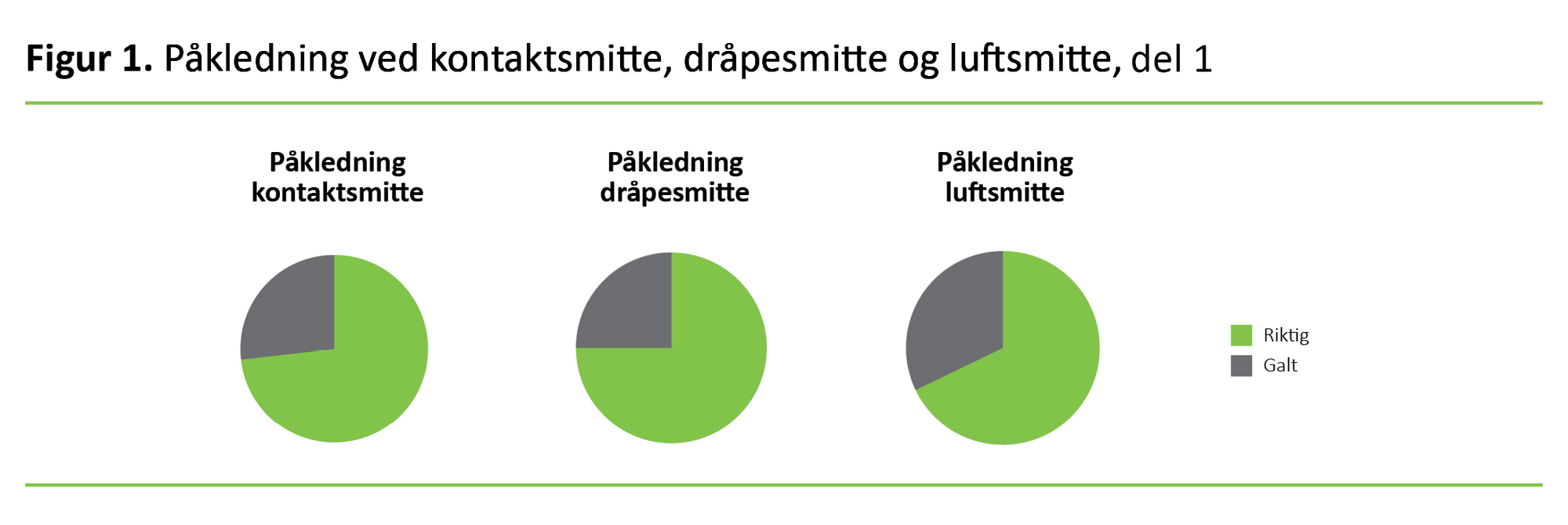 Figur 1 viser at i overkant av 25 prosent av deltakerne i denne kartleggingen oppga å bruke feil utstyr i forbindelse med påkledning i forkant av kontakt med en isolert pasient.