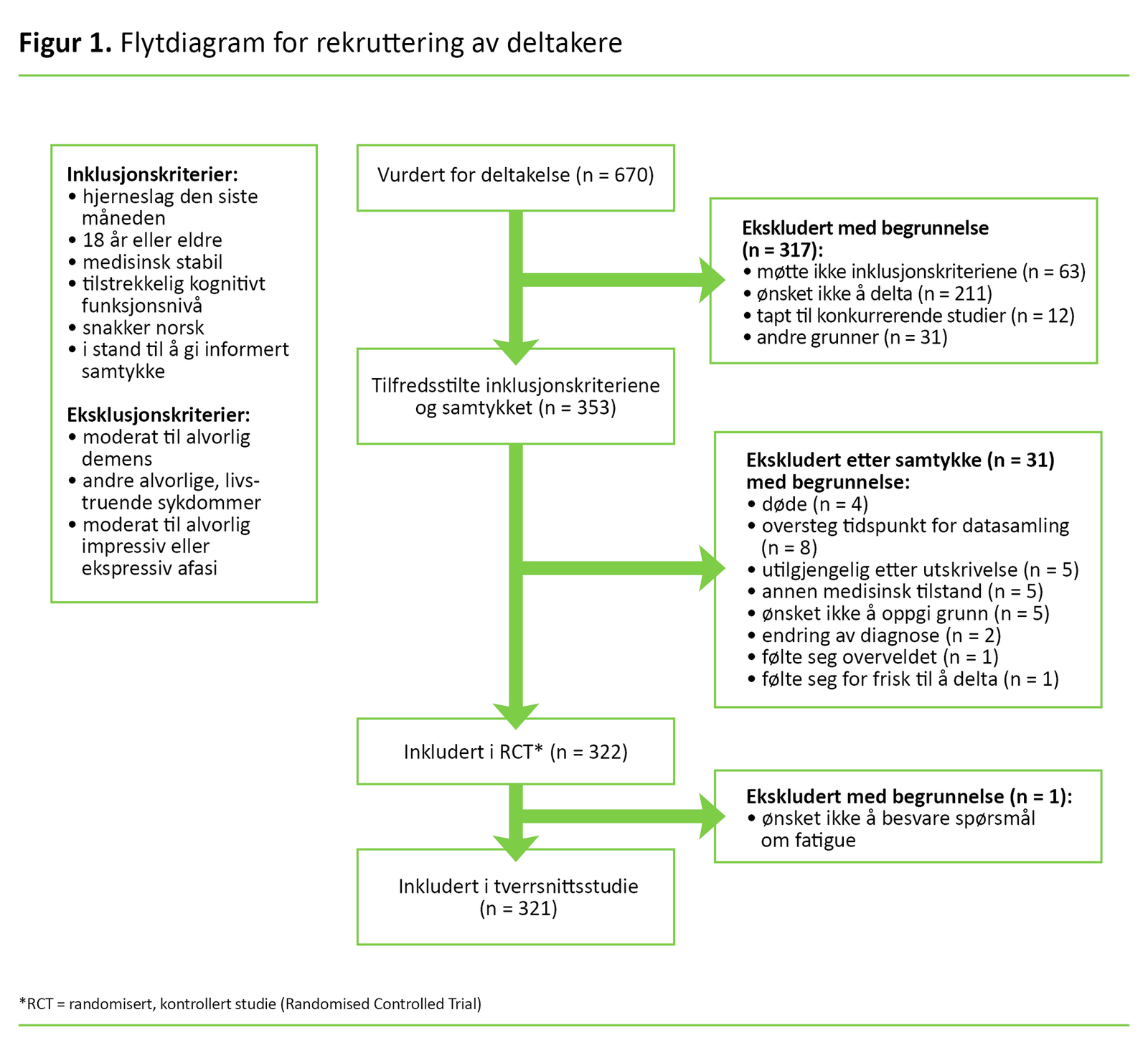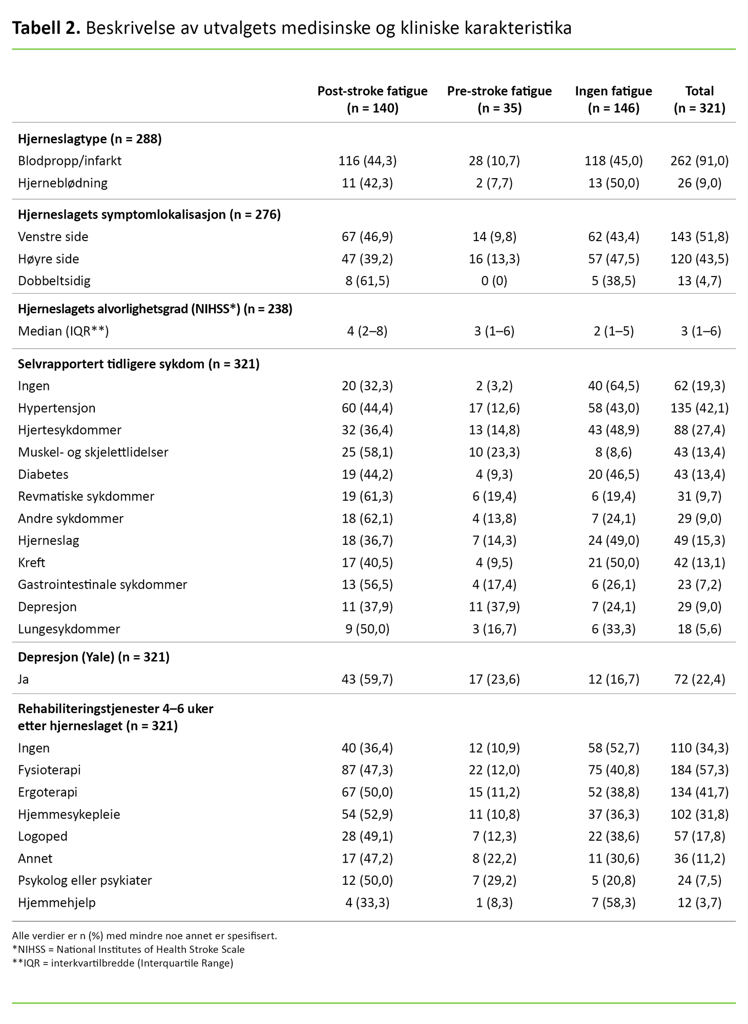 Metode: Tverrsnittsstudie som inkluderte 321 hjerneslagpasienter rekruttert fra 11 sykehus i Norge i perioden 2014–2016. Vi foretok datainnsamling med strukturert spørreskjema i individuelle intervjuer 4–6 uker etter hjerneslaget. Fatigue ble målt med en kortversjon av Fatigue Questionnaire (FQ). Vi benyttet multivariat logistisk regresjonsanalyse i denne studien.