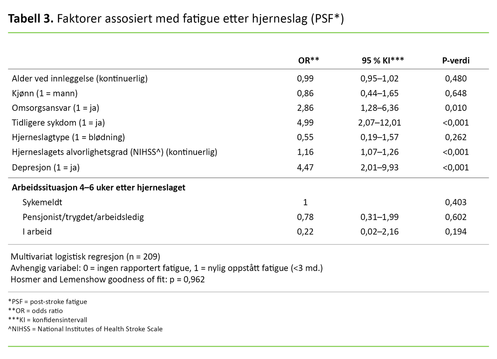 Pasienter som rapporterte om depresjon 4–6 uker etter hjerneslaget, hadde over fire ganger så høy odds (OR = 4,47; 95 % KI 2,01–9,93; p < 0,001) for å rapportere om PSF sammenliknet med pasienter som ikke rapporterte om depresjon. De som hadde omsorgsansvar for andre, hadde over 2,5 ganger høyere odds (OR = 2,86; 95 % KI 1,28–6,36; p = 0,01) for å rapportere om PSF sammenliknet med dem som ikke hadde omsorgsansvar.