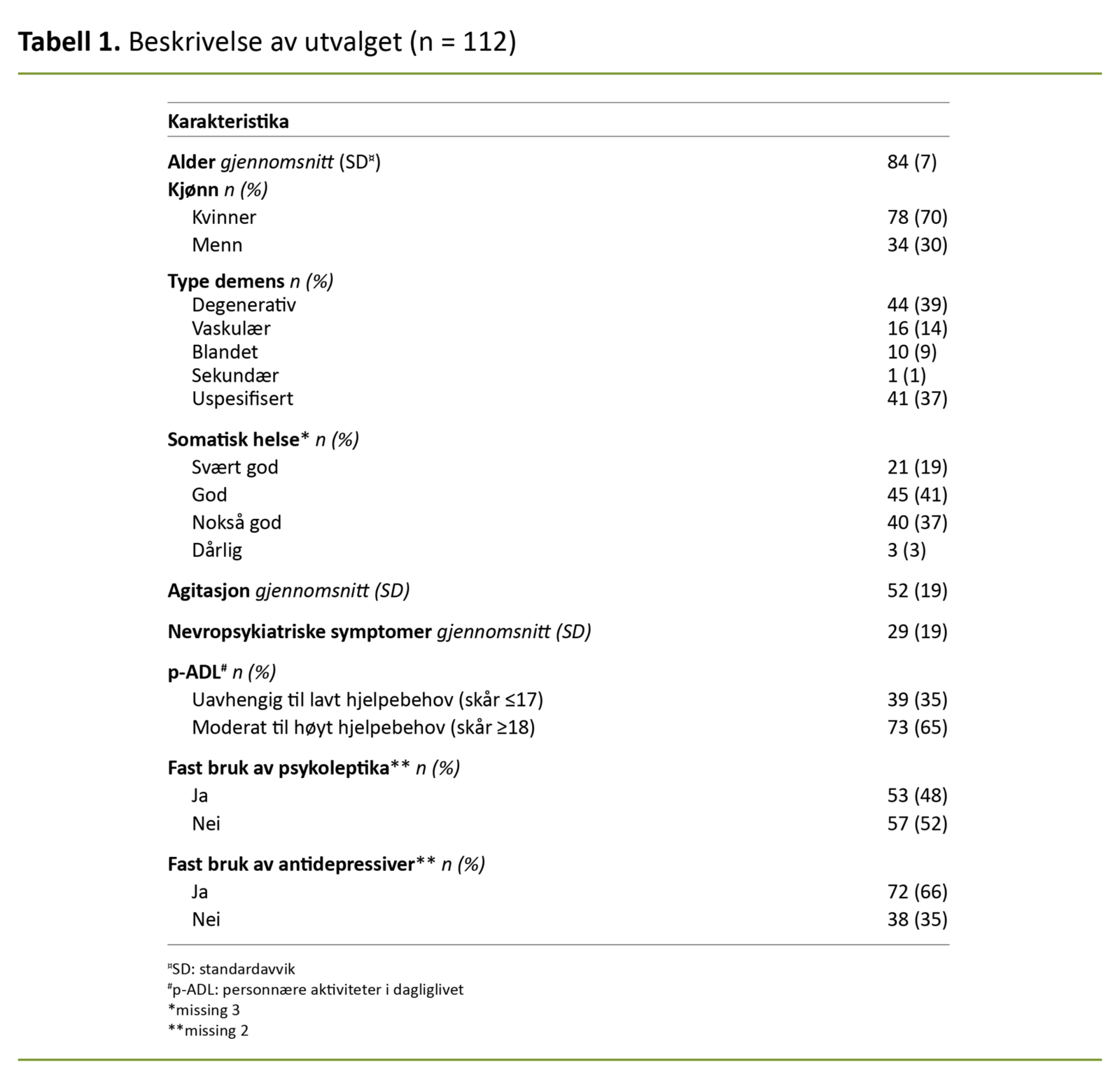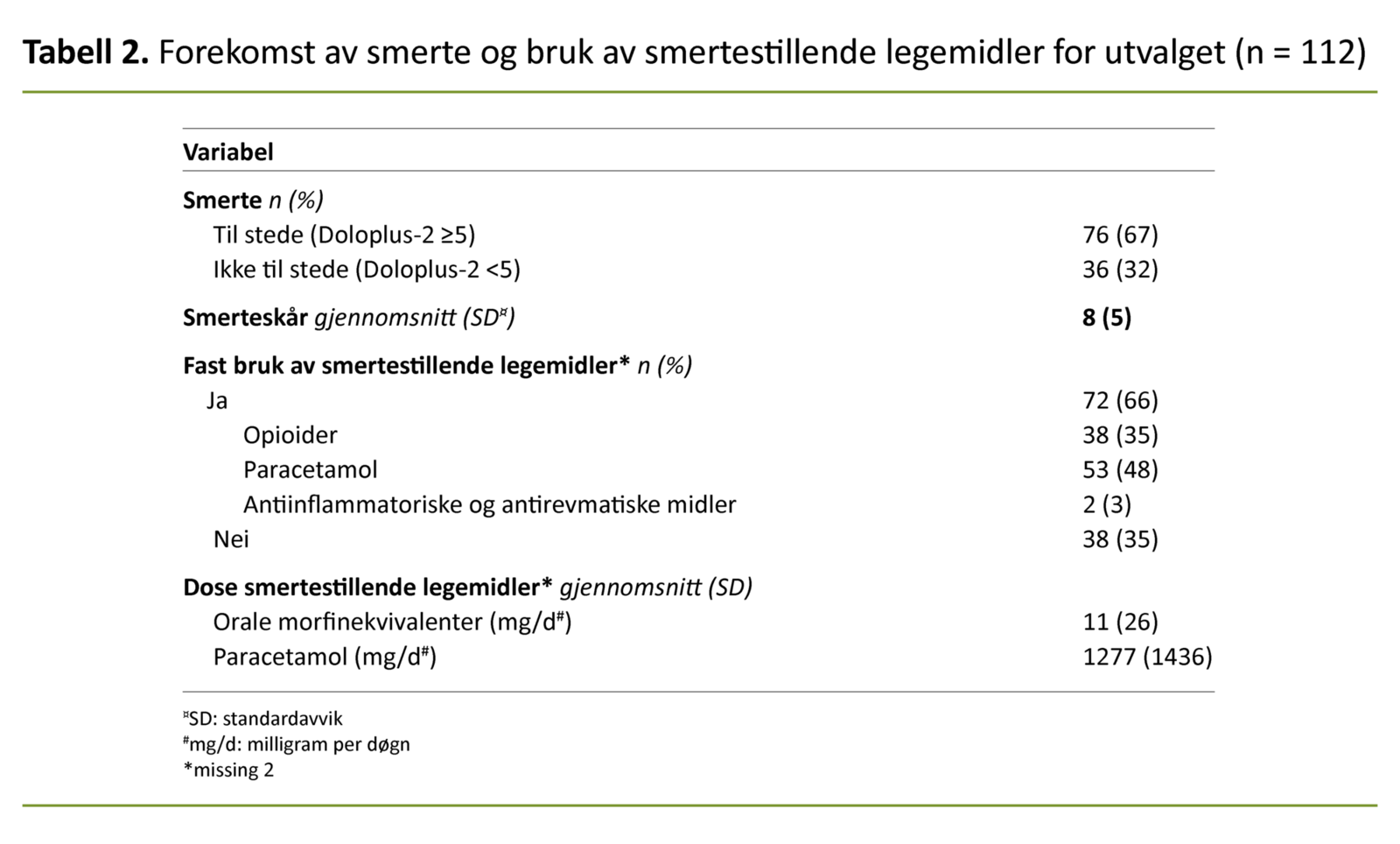Totalt deltok 112 sykehjemsbeboere fra 16 sykehjem i studien. Gjennomsnittsalderen for hele utvalget var 84 år, og 70 prosent var kvinner. Ytterligere beskrivelse av utvalget er gitt i tabell 1. Et av hovedfunnene er at kartleggingen med Doloplus-2 tilsa at to tredjedeler av utvalget hadde smerte. Se tabell 2 for informasjon om forekomsten av smerte og bruken av smertestillende legemidler.