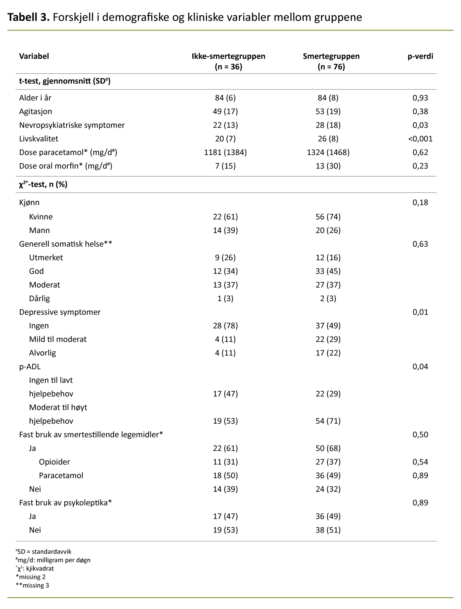I tabell 3 presenterer vi forskjellen mellom smertegruppen og ikke-smertegruppen med tanke på kliniske og demografiske variabler. Et annet hovedfunn er at gjennomsnittsskåren for NPS og livskvalitet (høyere skår indikerer lavere livskvalitet) er høyere i smertegruppen enn ikke-smertegruppen. Vi fant en sammenheng mellom smerte og høyere hjelpebehov i p-ADL og forekomsten av depressive symptomer.