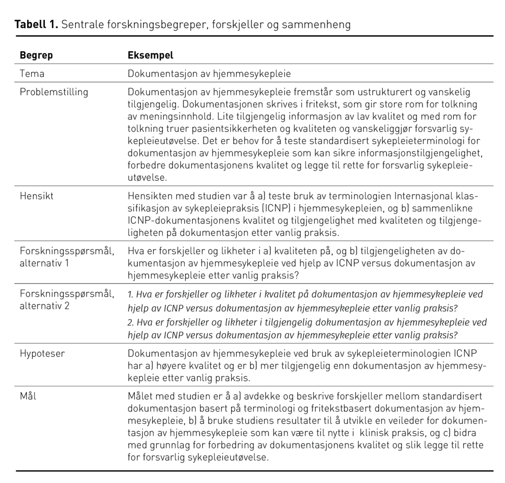 Inspirert av Polit og Beck (1) illustreres sentrale forskningsbegreper samt forskjellene og sammenhengen mellom disse i en egen tabell (tabell 1). I en god forskningsartikkel skal vi tydelig kunne se en rød tråd.