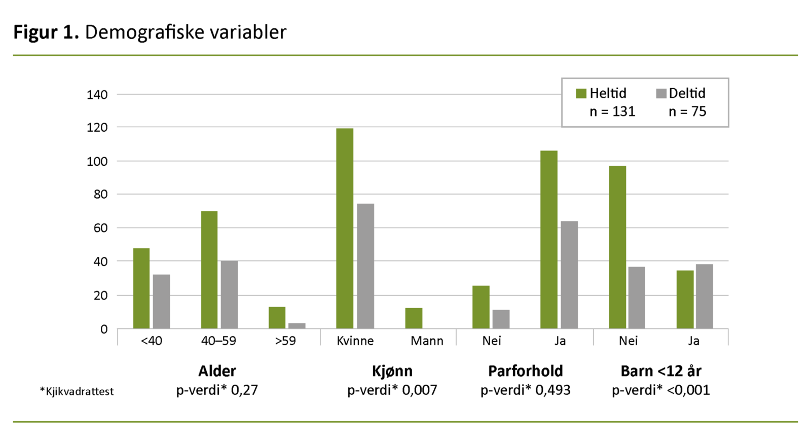 Det kom inn 206 svar på spørreskjemaet (45 prosent) fordelt slik: sykehjem 142, pleie- og omsorg 41, psykiatriske avdelinger 15 og helseinstitusjoner 8. Vi utførte kjikvadrattest for å se om heltidsansatte og deltidsansatte var signifikant forskjellige på ulike bakgrunnsvariabler (figur 1).