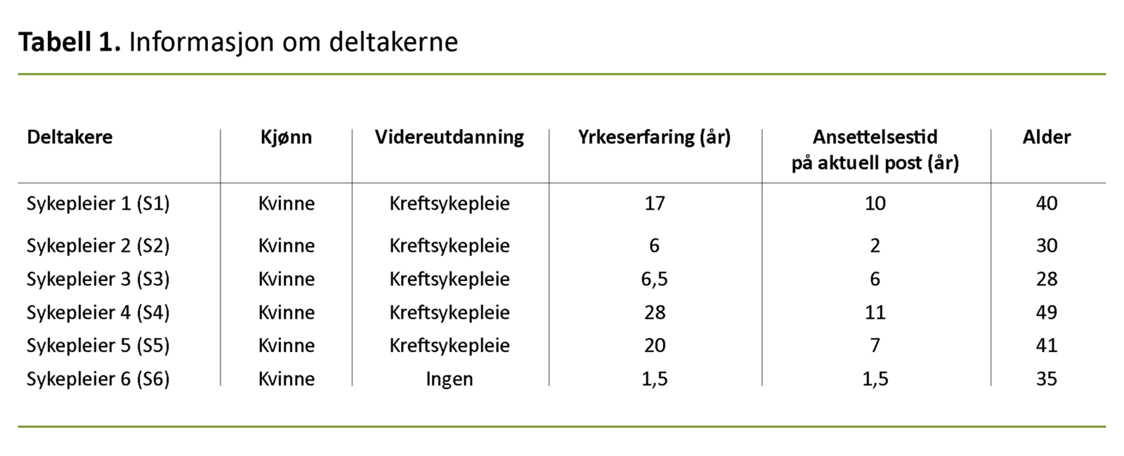 Alle deltakerne var kvinner, hvorav fem deltakere var kreftsykepleiere. Gjennomsnittsalderen var 37,2 år, gjennomsnittlig yrkeserfaring var 13,2 år, og gjennomsnittlig ansettelsestid var 6,3 år. Se tabell 1 for deltakerinformasjon.